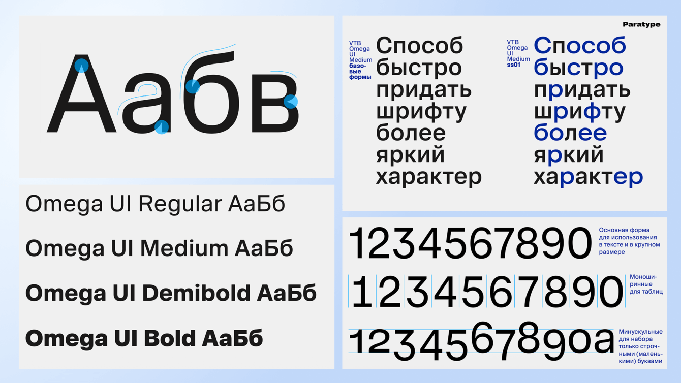 Совместно с компанией Paratype разработали шрифт Omega UI — переосмысление и эволюционное развитие VTB Group UI. Он стал современнее, диджитальнее и дружелюбнее, а цифры — ключевой визуальной доминантой ВТБ Онлайн.