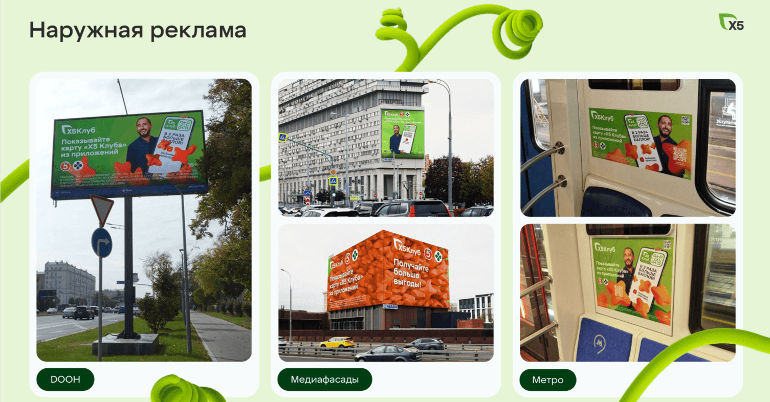 5. Кампанию активно поддерживали в СМИ, Telegram и собственных каналах (не только площадки брендов лояльности, но и ВК и Telegram других бизнес-единиц Х5). Мы рассказали о кейсе с Демисом для маркетинговых СМИ, поддержали это в релевантных каналах (Сосисочная, Русский маркетинг, Трендач и др), параллельно посеяли и сам ролик с Демисом, чтобы охватить как можно больше аудитории (Mash, Банкста и другие). О наших ярких медиафасадах рассказало более 10 крупных ТГ-каналов (SHOT, Москвач и т.д.) – в них публиковали ролик с CGI – эффектом - баллы от выгодных покупок просто «засыпали» Демиса.