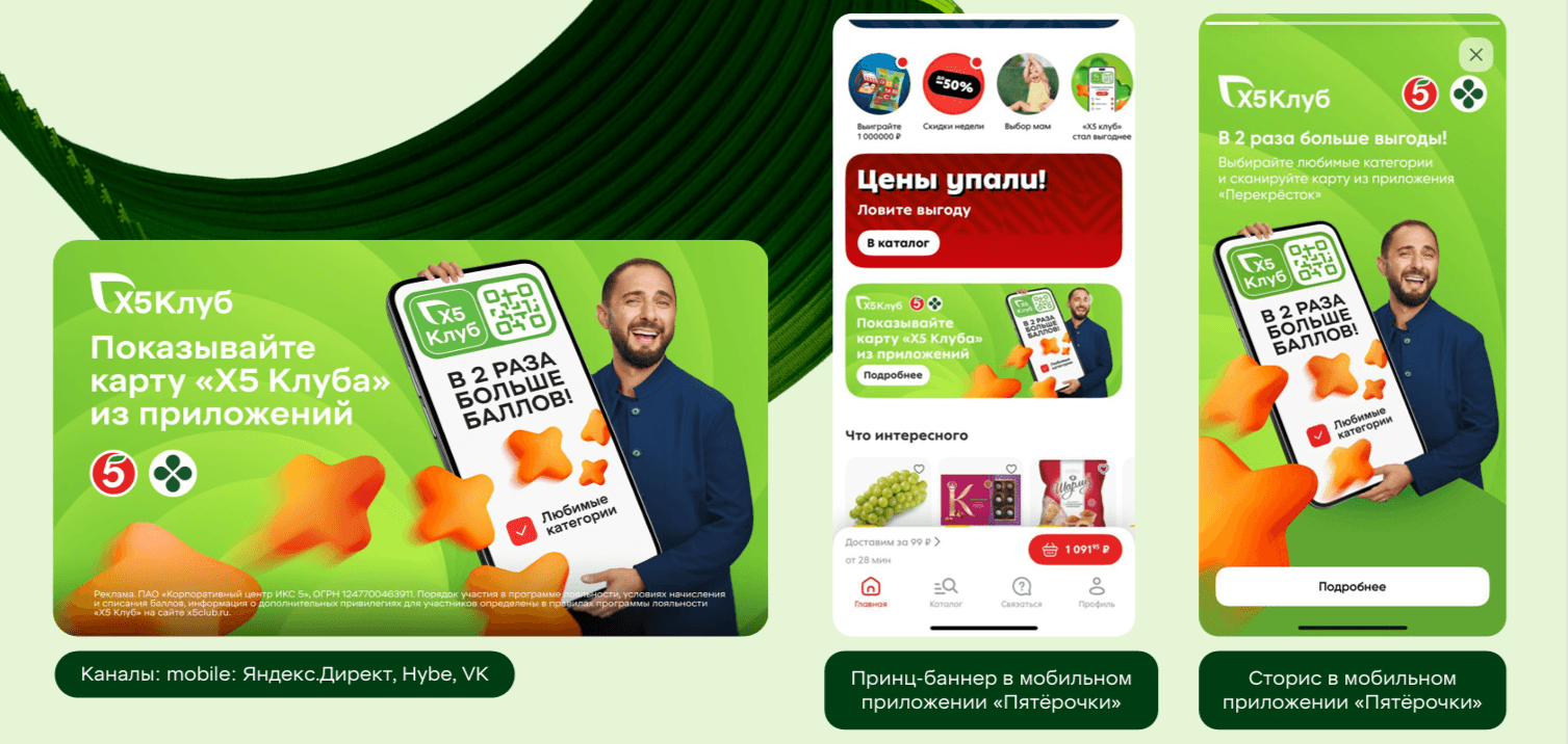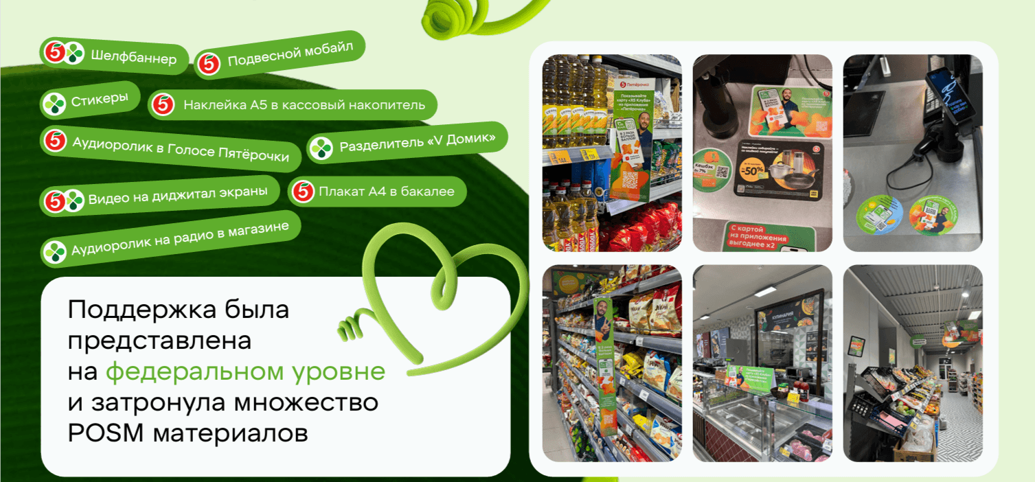 Мы охватили разнообразные каналы коммуникации, чтобы подсветить ценностное предложение, но в каждой точке контакта учитывали окружающий контекст. Например, адаптировали лайны и имиджи в POSM instore и роликах под конкретную торговую сеть. А главное – активировали рассмотрение и использование карты лояльности из мобильного приложения через мягкое сравнение пластика и карты из приложения в самый волнительный и уязвимый момент нахождения в магазине — на кассе.