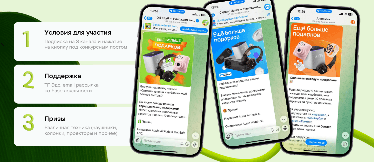 1. Для дополнительной поддержки мы запустили конкурс от трех брендов лояльности Х5 («Х5 Клуб», сервис «Пакет» и сервис Апельсин), поддержали его TG ads и email-рассылкой.