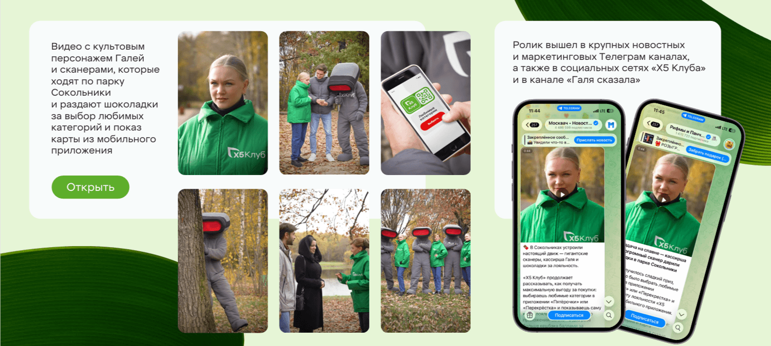 4. Реализовали оффлайн-спецпроект, который завирусился в Телеграм. В городской парк в Сокольниках вышли культовый персонаж Галя и гигантские сканеры, которые раздавали шоколадки за выбор любимых категорий и показ карты из мобильного приложения.