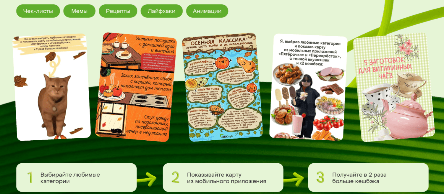 3. Запустили нативную кампания в поддержку ФРК, которая включала в себя чек-листы, мемы, рецепты, лайфхаки и анимации, которые драйвили наш основной тезис: выбирайте любимые категории, показывайте карту из мобильного приложения и получайте в 2 раза больше кешбэка.