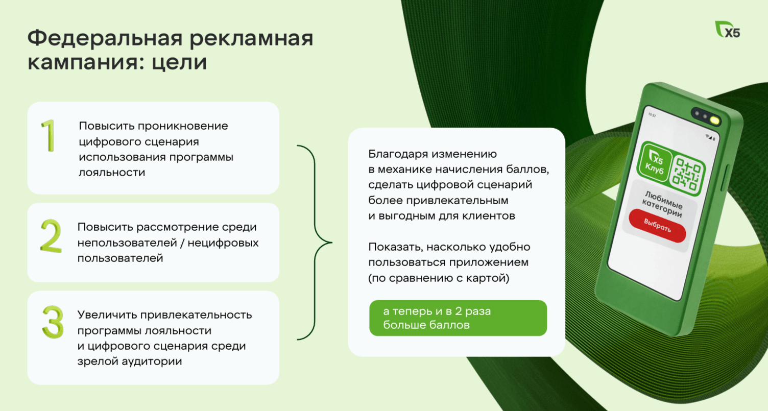 Основная цель – стимулирование использования цифрового сценария для программ лояльности, то есть перевода большей части пользователей, особенно тех, кто меньше пользуется смартфонами, в мобильное приложение с одновременным акцентом на выгоду от выбора любимых категорий.