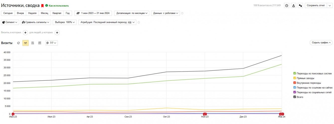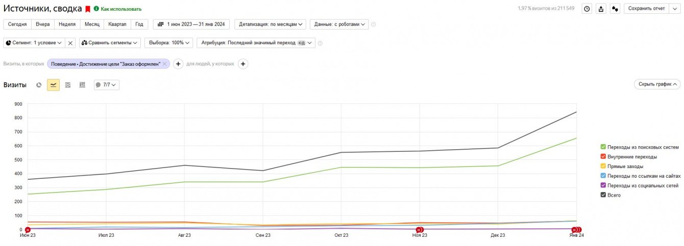Большая реорганизация и коренная переработка дизайна и проекта в целом, разумеется, должна давать ощутимый, понятный и главное - оцениваемый результат.Начиная работы, мы прогнозировали следующие цифры - рост посетителей сайта не менее чем 25% к показателям июня 2023 года. Рост числа заказов - не менее 15%. Горизонтом достижения показателей был установлен период 8-9 месяцев.Итоговые результаты превзошли наши ожидания, а главное - ожидания клиента.По итогам проведенных работ проект вышел на следующие показатели роста:1. Рост трафика - +82%