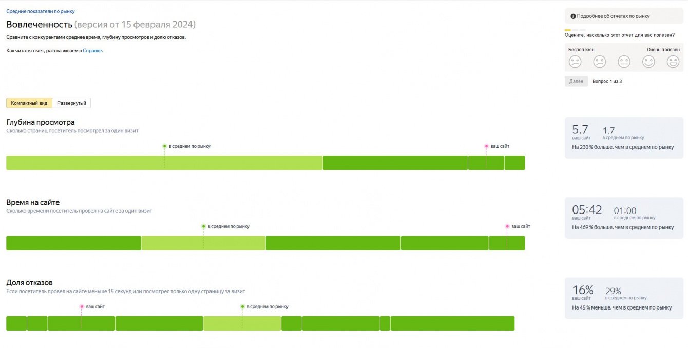 3. Глубина просмотра - 5,7 (среднее по рынку - 1,7)4. Время на сайте - 5 минут 42 секунды (среднее по рынку - 1 минута)5. Доля отказов - 16% (среднее по рынку 29%)