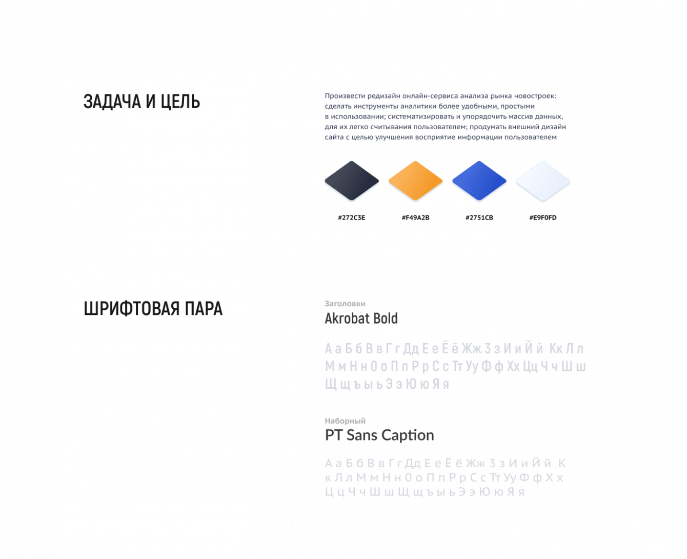 Произвести редизайн онлайн-сервиса анализа рынка новостроек: сделать инструменты аналитики более удобными, простыми в использовании; систематизировать и упорядочить массив данных, для их легко считывания пользователем; продумать внешний дизайн сайта с целью улучшения восприятие информации пользователем