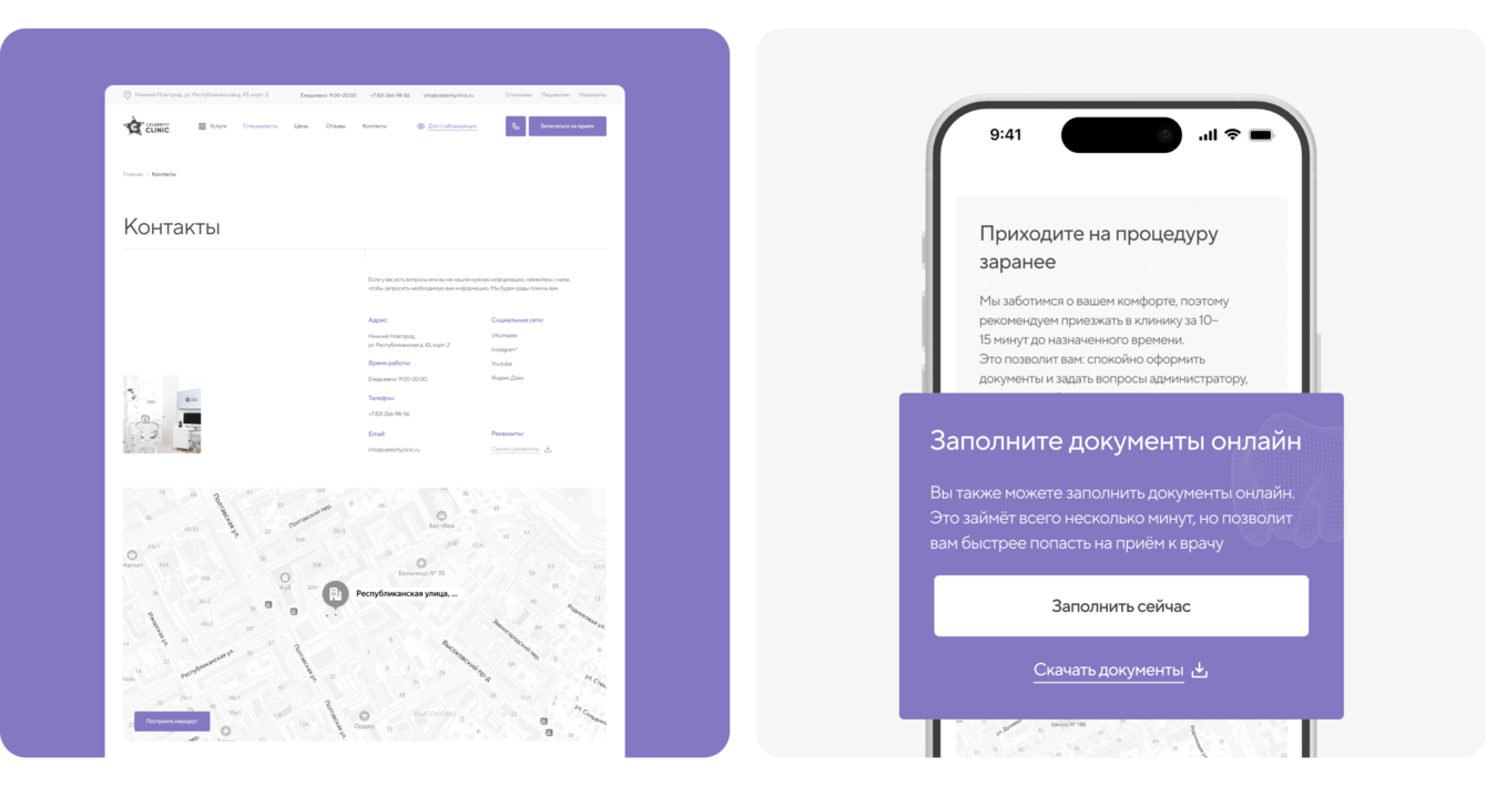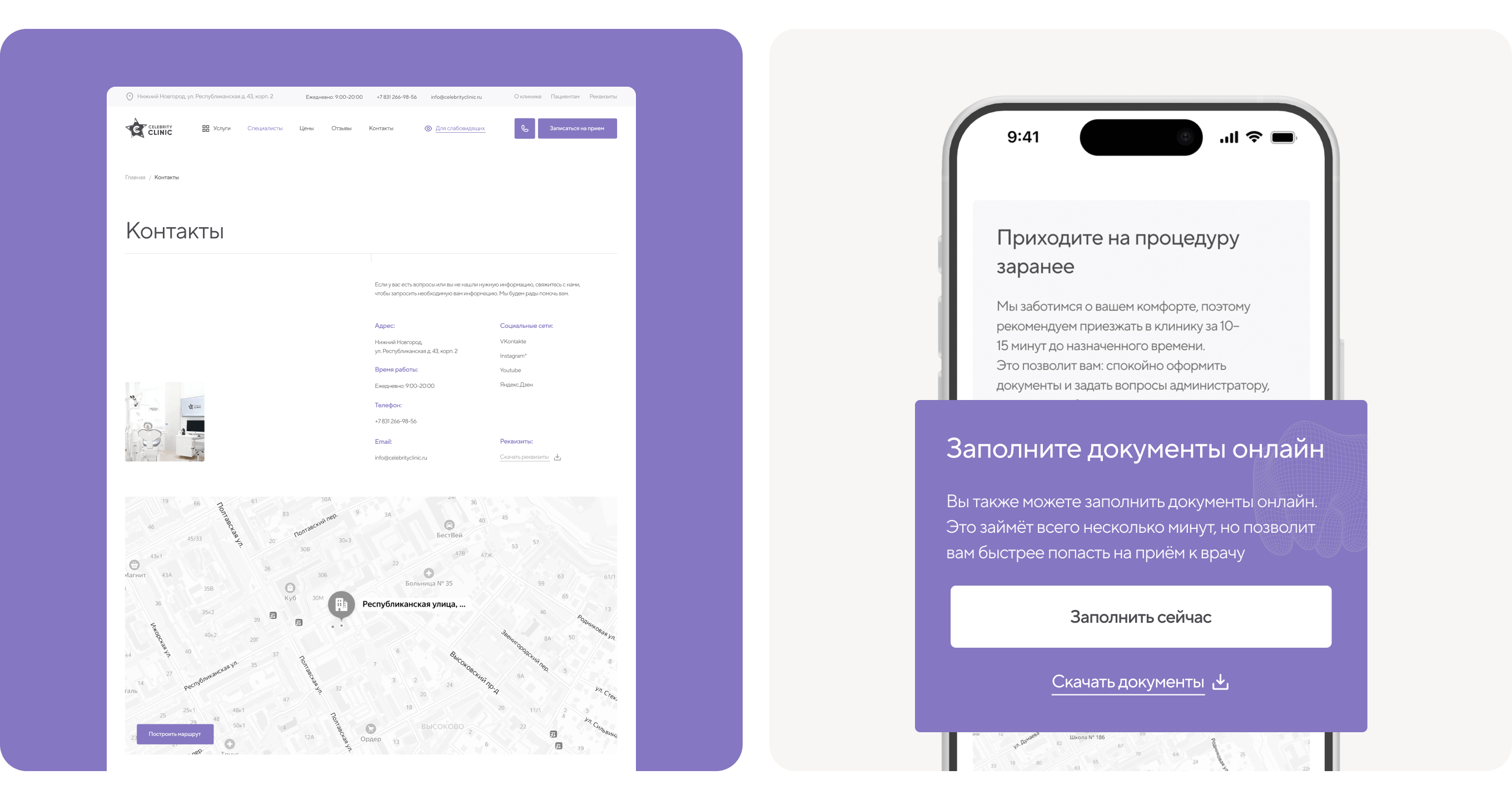 - Визуальная идентичность обрела системность и выразительность — теперь стиль клиники ощущается во всём: от шрифтов и цвета до микровзаимодействий и анимации.