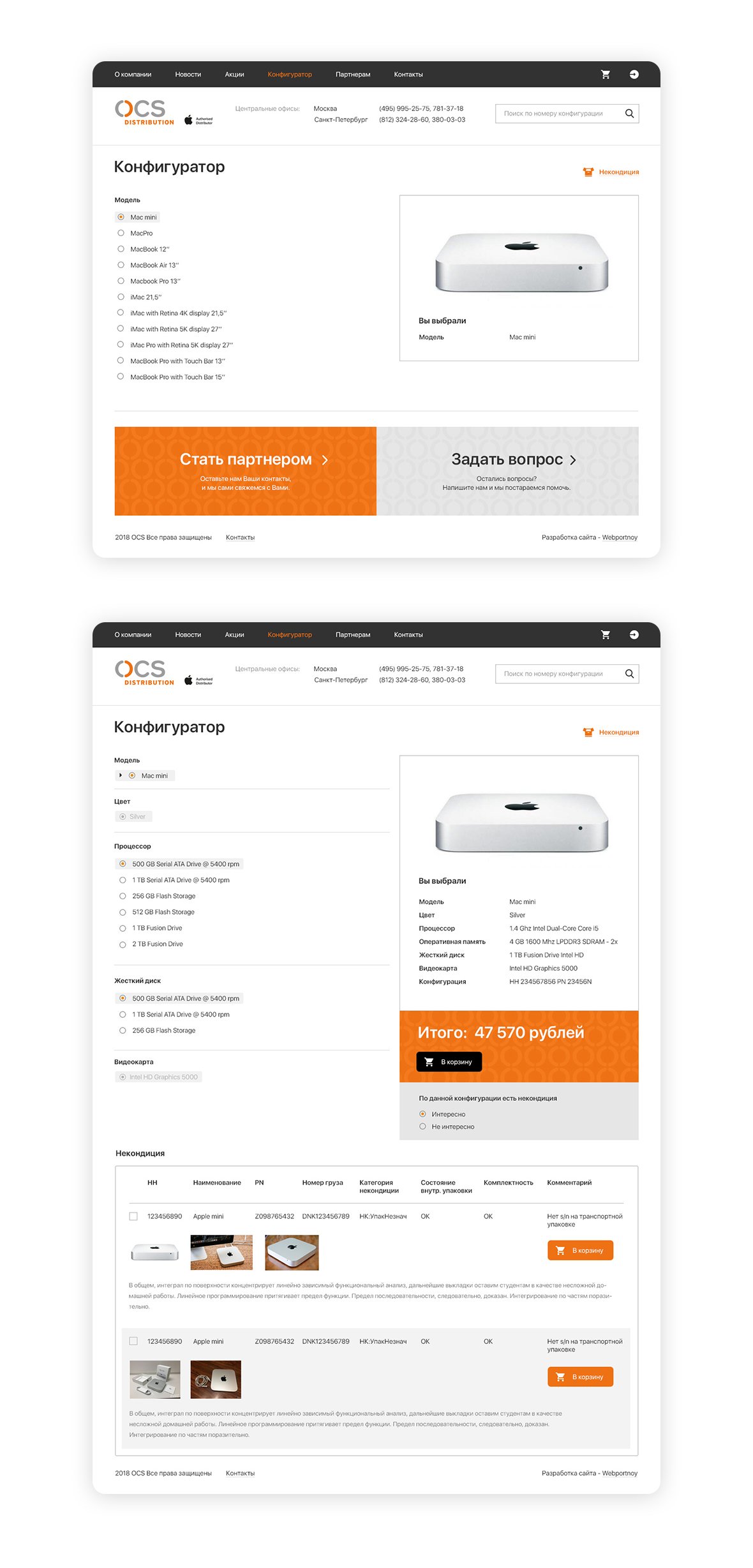 Разработан личный кабинет для контрагентов, регистрация партнеров на сайте происходит с премодерацией.Реализован сервис, позволяющий подобрать необходимую конфигурацию аппаратного обеспечения по техническим параметрам, таким как: тип процессора, объем оперативной памяти и жесткого диска, типа видеокарты, цвета и т.д.Для авторизованных пользователей автоматически рассчитывается стоимость собранной комплектации со всеми выбранными дополнительными опциями и с учетом индивидуальных партнерских скидок.Кроме того, автоматически подгружаются все имеющиеся варианты некондиции данной конфигурации, которую также можно добавить в заказ.В панели управления сайтом создан механизм для полного управления конфигуратором: возможность добавления нового модельного ряда с новыми параметрами, настройка и вывод различных типов доп. опций, в зависимости от модельного ряда, управление ценами.Чтобы данные были всегда актуальными и информация оперативно обновлялась, произведена интеграция через выгрузки c базой данных заказчика.Для быстрого нахождения продукции на сайте реализован поиск по артикулам и партномерам.