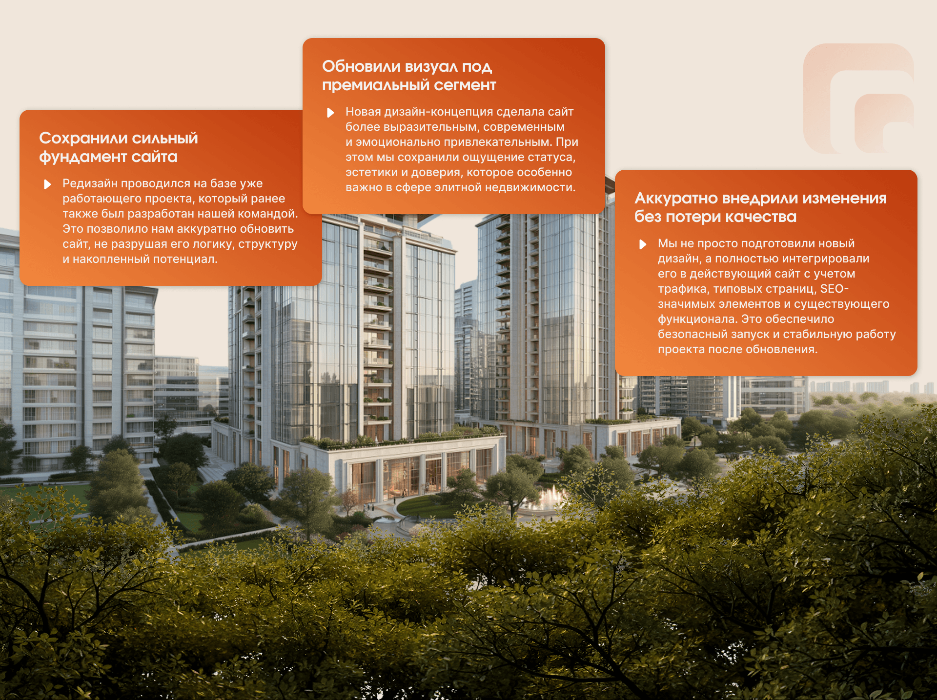 Итогом стал редизайн, который не просто сделал сайт красивее, а усилил его как инструмент продаж и презентации бренда на рынке элитной недвижимости.