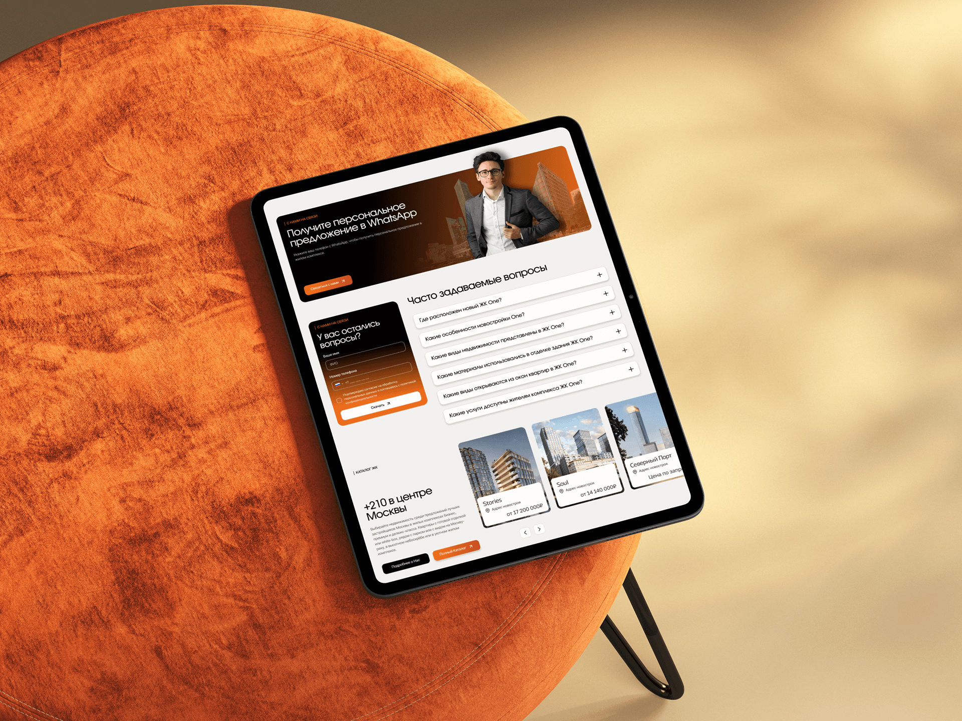 После аналитики мы перешли к разработке новой визуальной концепции. Для клиента было подготовлено четыре варианта стилистического решения в разных цветовых направлениях, каждое из которых по-своему отражало эстетику премиального сегмента. В ходе обсуждений была выбрана оранжевая цветовая гамма — выразительная, теплая и запоминающаяся, но при этом достаточно статусная для рынка элитной недвижимости.
