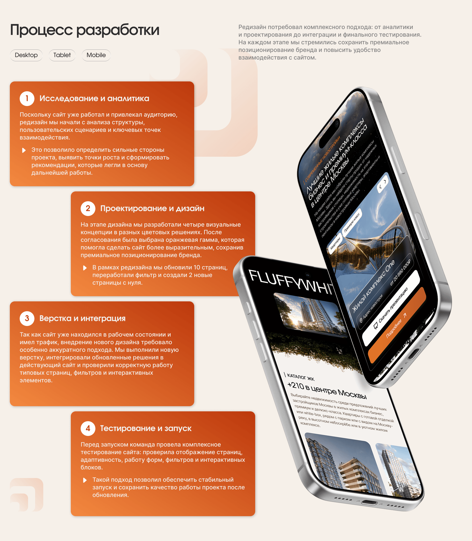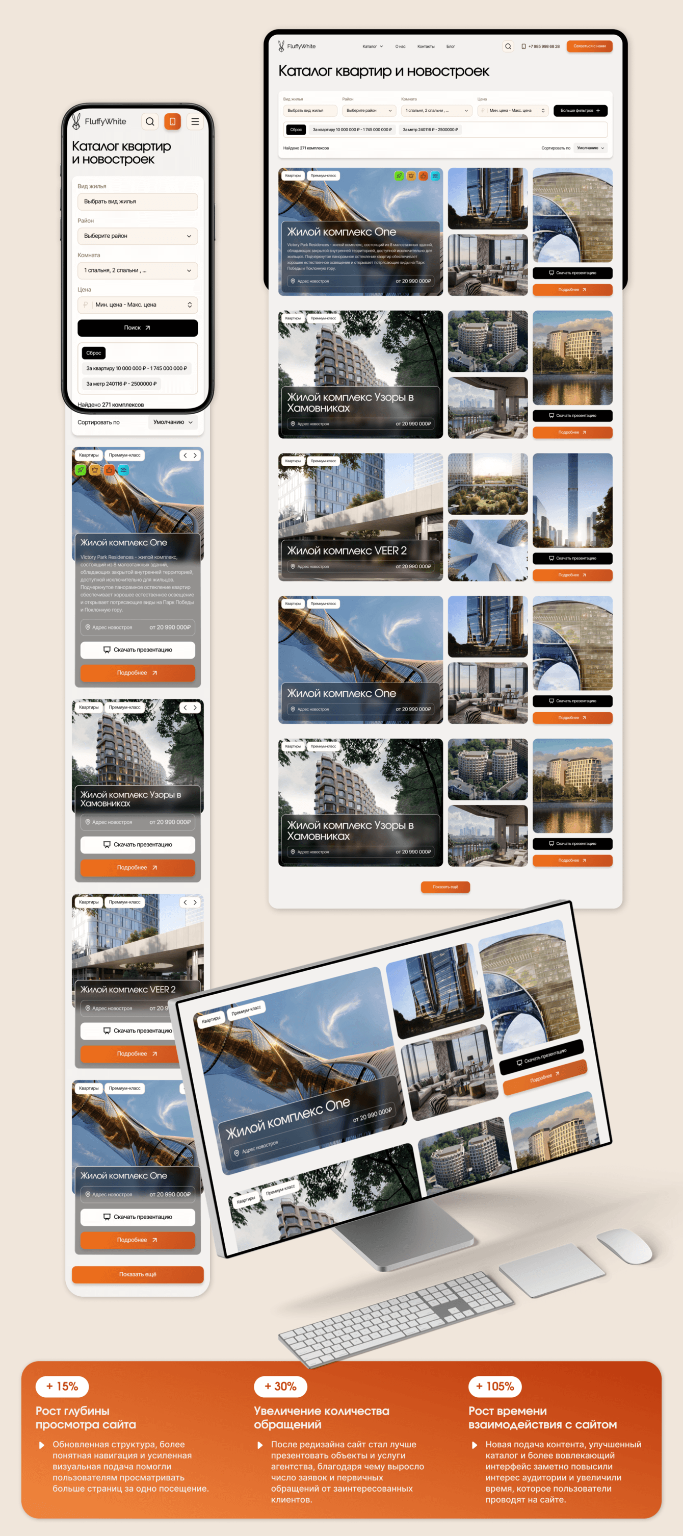 Перед нами стояла задача не просто “освежить дизайн”, а провести продуманный редизайн: сделать сайт более современным, выразительным и удобным, подчеркнуть премиальный характер объектов, усилить визуальную подачу и повысить вовлеченность пользователей без потери уже достигнутых результатов. А также доработать технически каталог.
