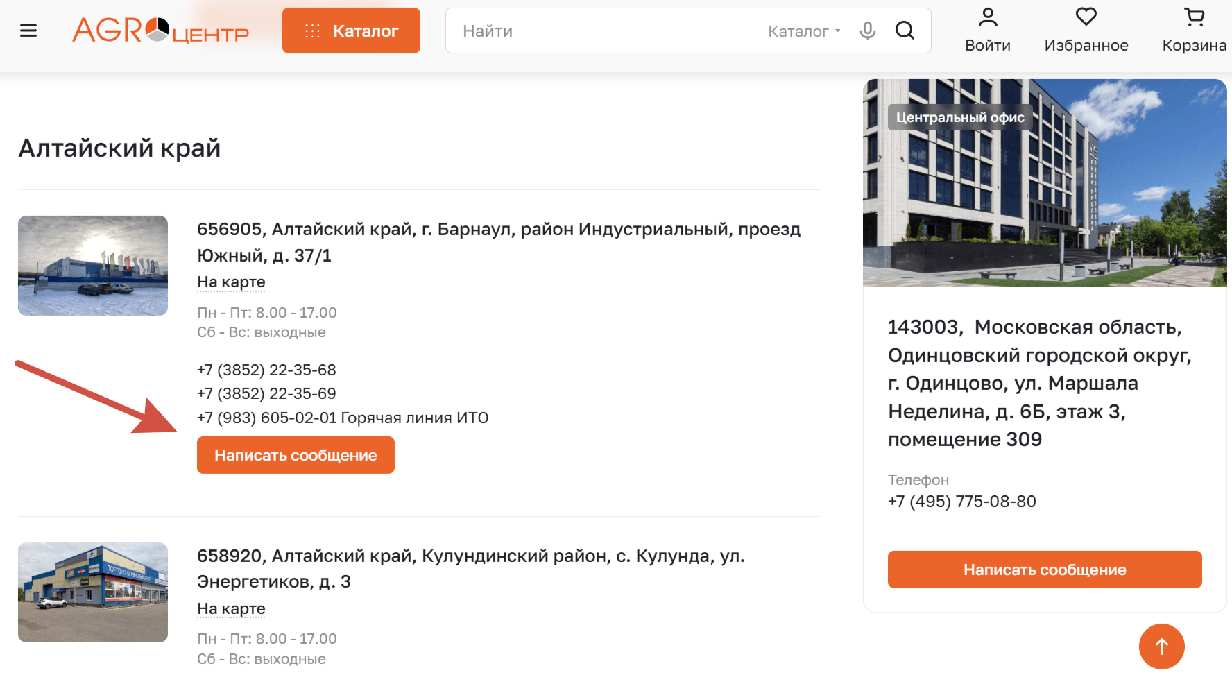 Кнопки «Написать сообщение» добавили также напротив каждого регионального представительства в разделе «Контакты».