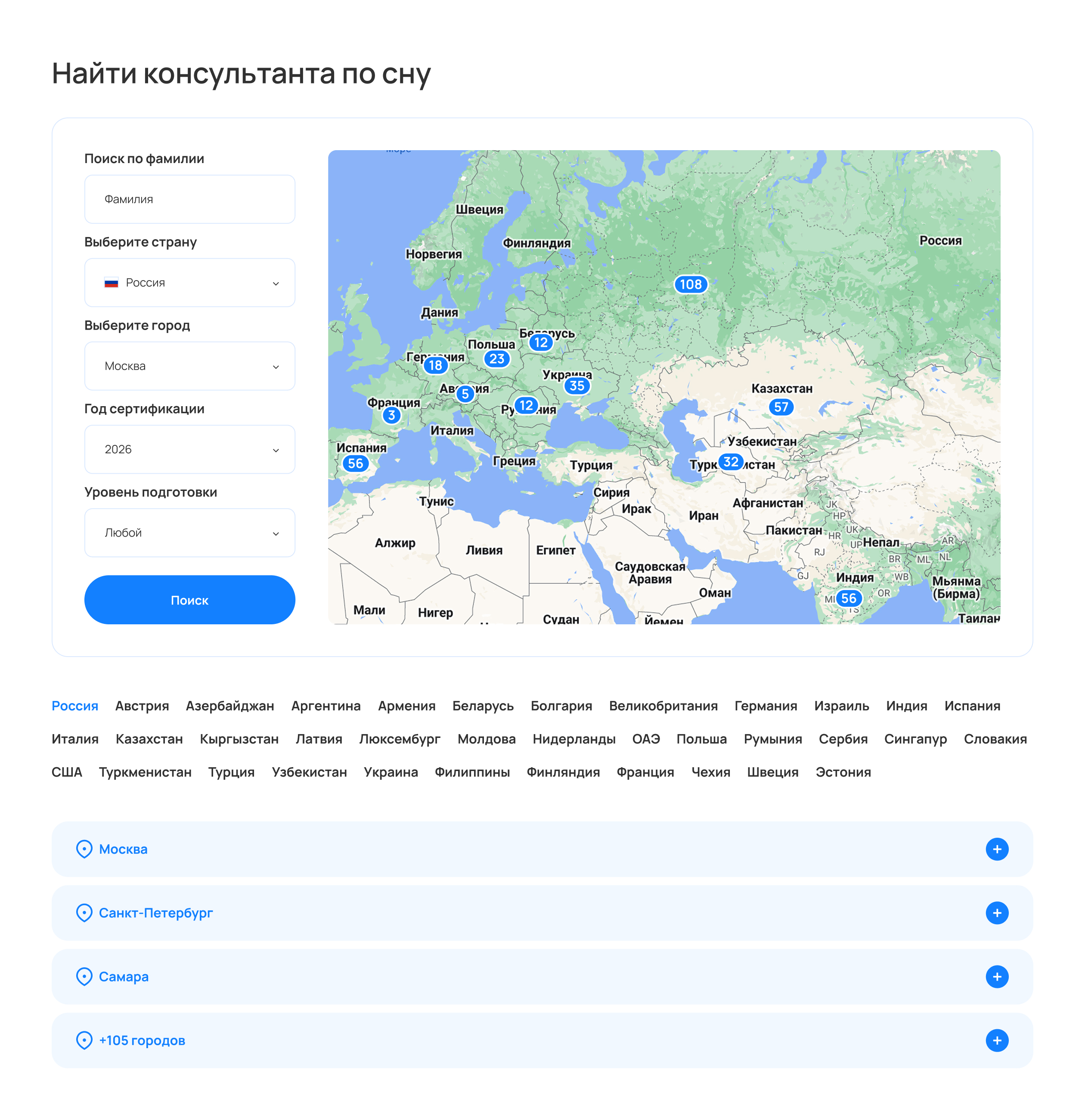 Мы разработали интерактивную карту в реестре выпускников. 800+ дипломированных специалистов из 39 стран (от Аргентины до Японии). По клику открывается выборка по стране и городу. Это мгновенно продает масштаб школы и работает на SEO.