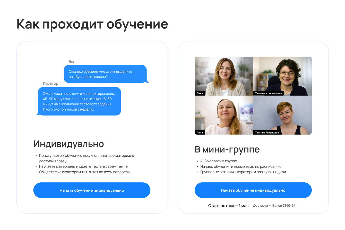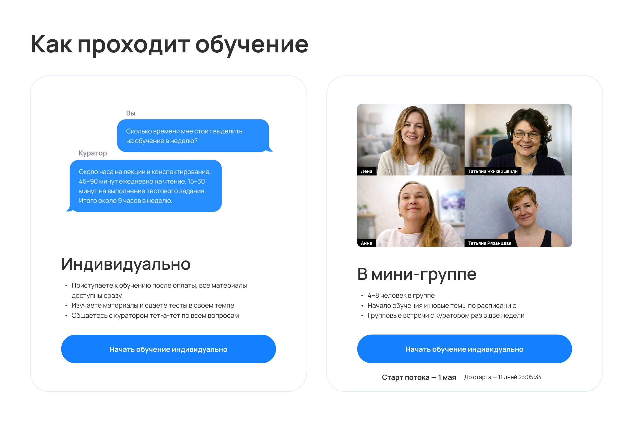 - Визуальный апселл (Up-sell): на более дорогих тарифах добавлены контрастные цветовые теги («+2 месяца практики», «+6 месяцев сопровождения»). Они сразу цепляют взгляд и мотивируют абитуриента выбрать пакет с более высоким чеком.