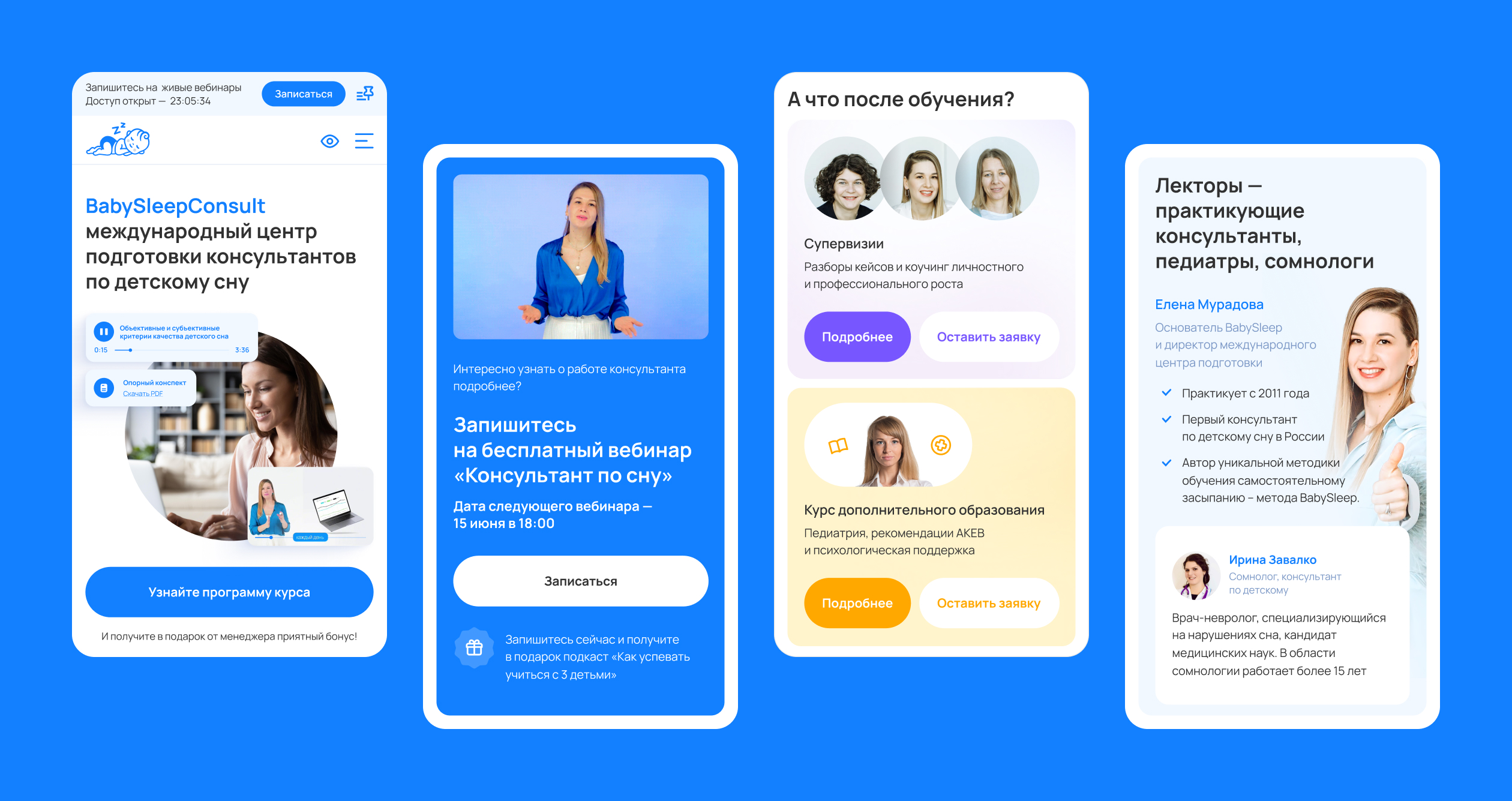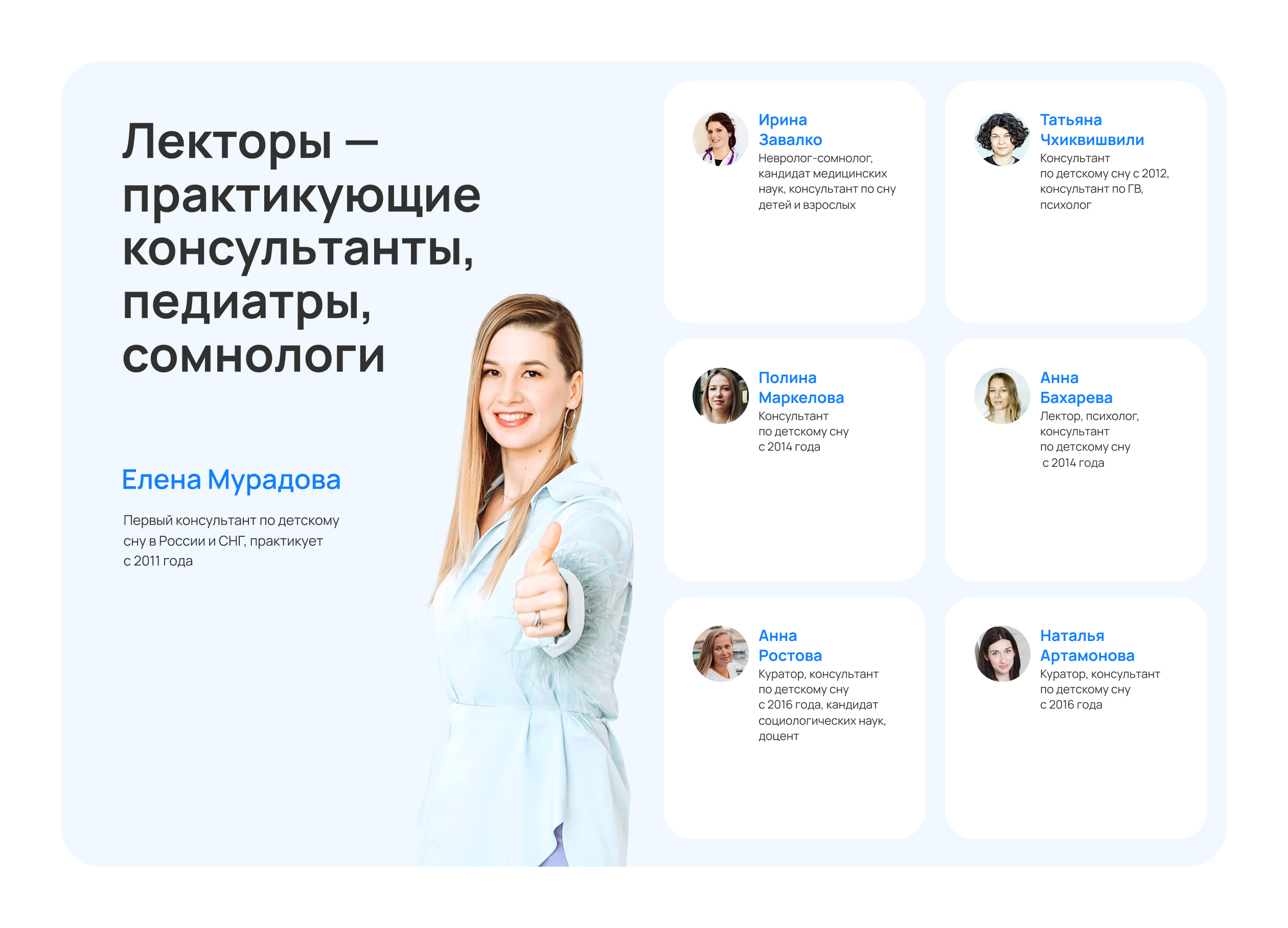 Ниша детского сна напрямую связана со здоровьем. У аудитории (мам) высокий порог тревожности и скепсиса. Чтобы снять возражение «А кто меня будет учить?», мы спроектировали детальные профили преподавателей.