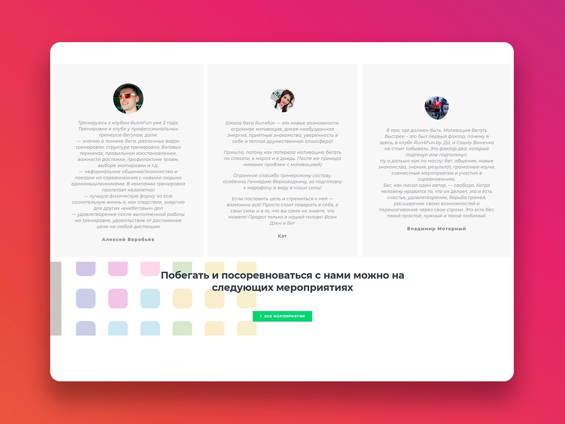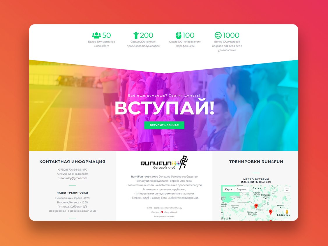 В данном случае получилось именно такое сотрудничество. Занимаясь в клубе @run4fun.by, мы сразу нашли общий язык с основателем Алексеем Чемодановым и приступили к работе над сайтом. Результат до сих пор радует обе стороны, а также участников клуба.