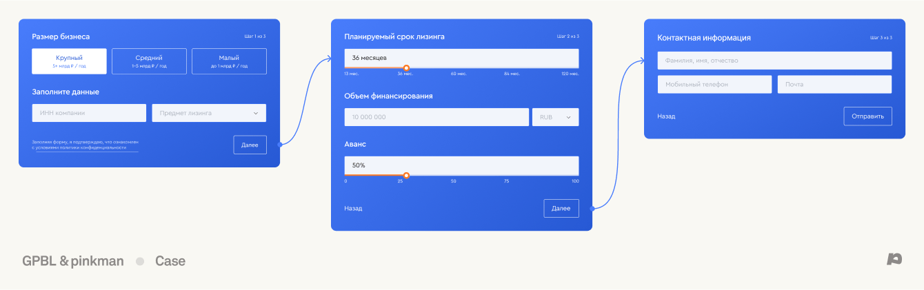 Для общих контактов сделали удобную форму, на которую просто попасть с любой страницы. В ней всего три шага и она сразу отсеивает нерелевантные заявки — при выборе малого бизнеса тебе предложат услуги других компаний группы.
