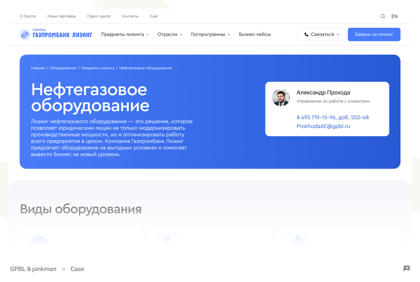 У компании несколько типов предметов лизинга, которые, в свою очередь, делятся на десятки подкатегорий. Кроме того, предложения делятся по отраслям. Специфика клиента на этом рынке такая, что он точно знает, что ему нужно, и он должен это увидеть на сайте. Это большой объем информации, который при этом объединен сквозной навигацией. Контента было много, его предоставлял заказчик — помогала постоянная синхронизация и регулярные синки по ходу всего проекта.