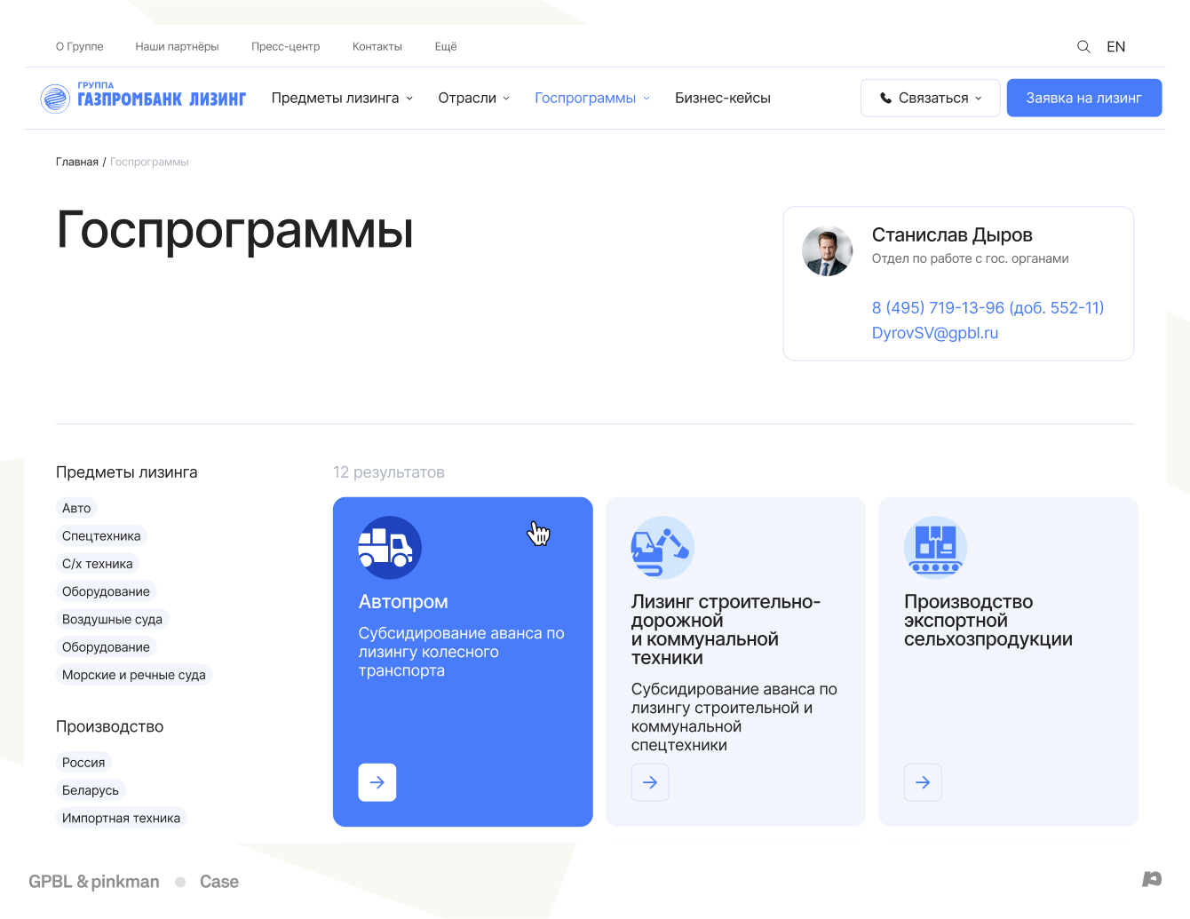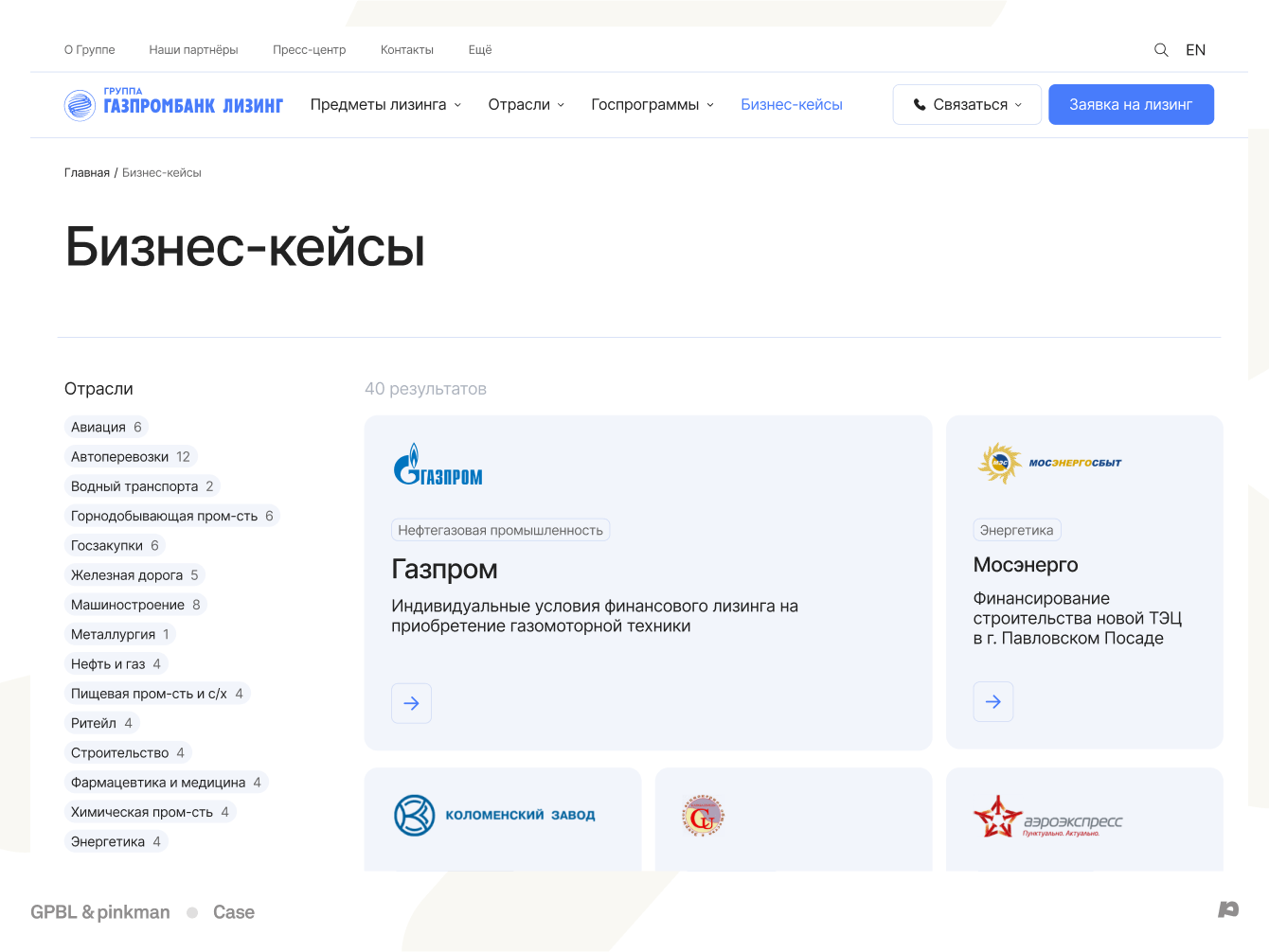У компании много предметов лизинга и отраслей, в которых она работает. Нужна была понятная и простая навигация, чтобы можно было быстро найти нужную информацию.