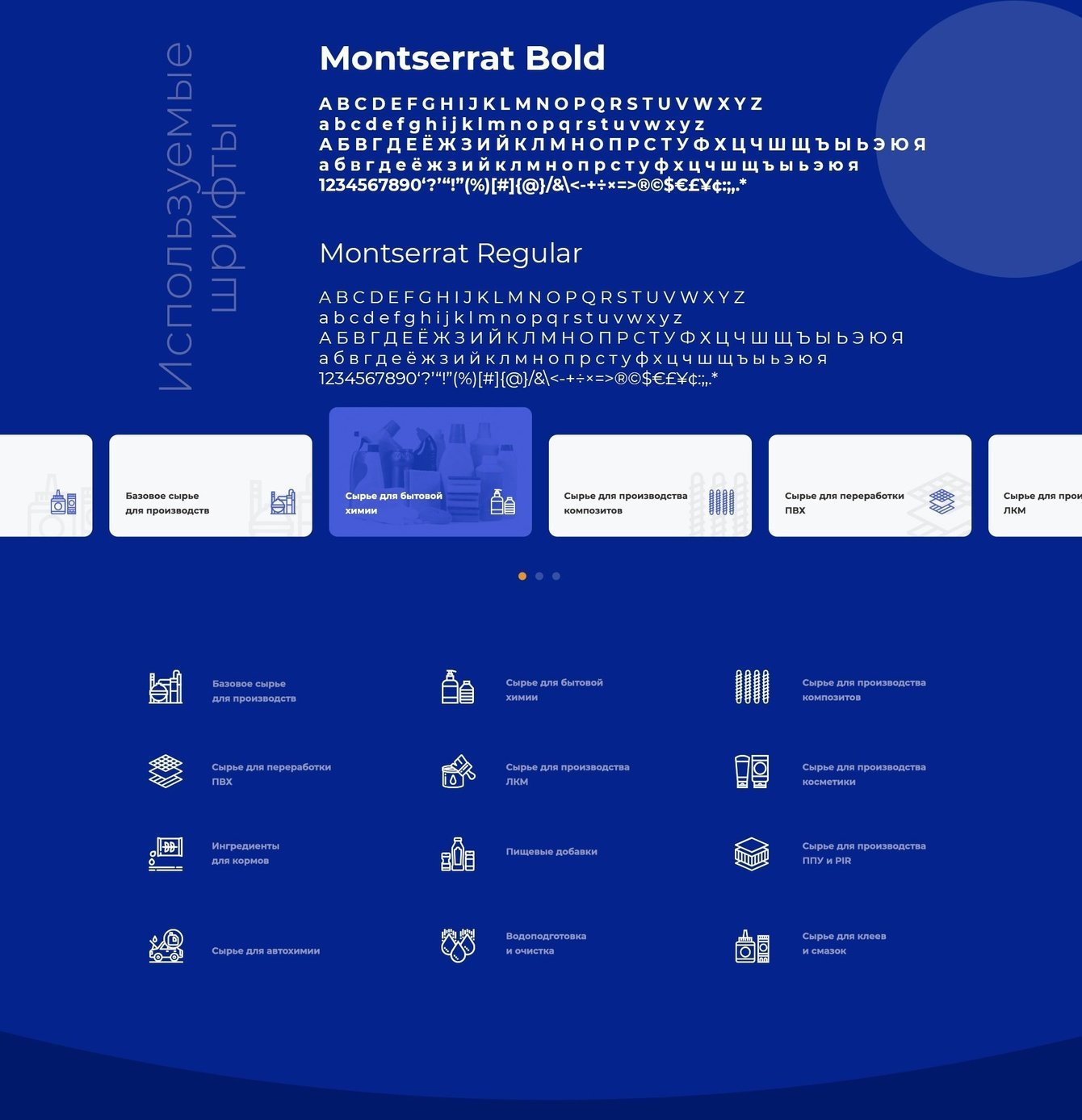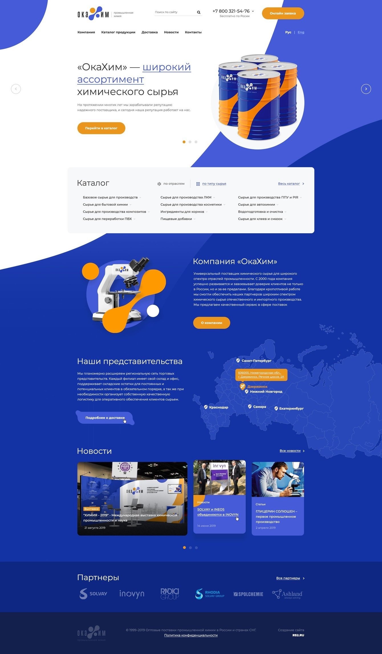 Основная задача главной страницы — дать полное представление о продукции и услугах компании и направить пользователя на каталог продукции. Слайдер в первом блоке знакомит посетителя со всеми направлениями деятельности ГК «ОКАХИМ». Особый акцент сделан на способности компании не только доставлять продукцию, а также фасовать и хранить её.
