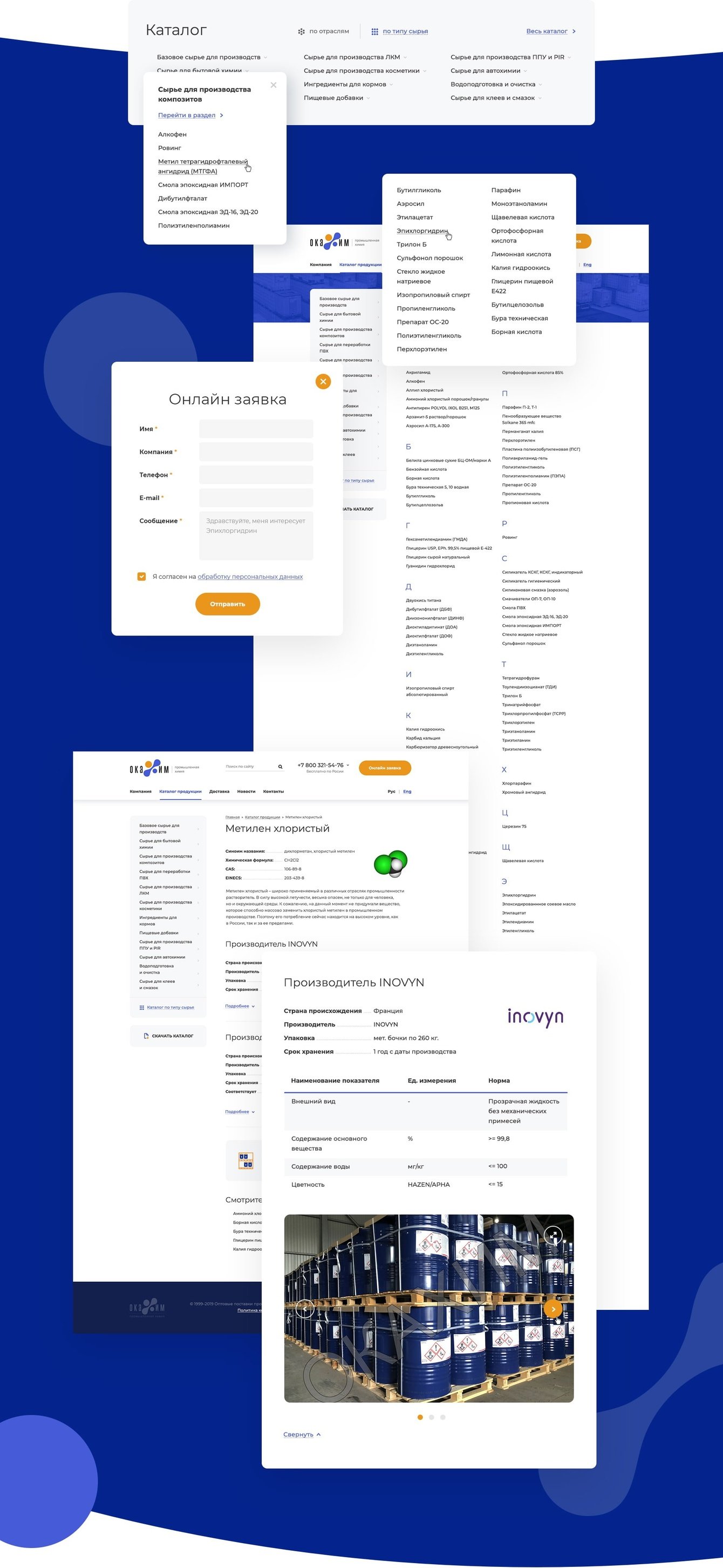 На этапе предпроектной аналитики стало очевидно, что потребители могут искать необходимую продукцию двумя основными путями: либо по типу сырья и химической формуле — соли, кислоты, гликоли и т.п., либо по отраслям применения — сырьё для бытовой химии, пищевые добавки, сырьё для переработки ПВХ и т.д.