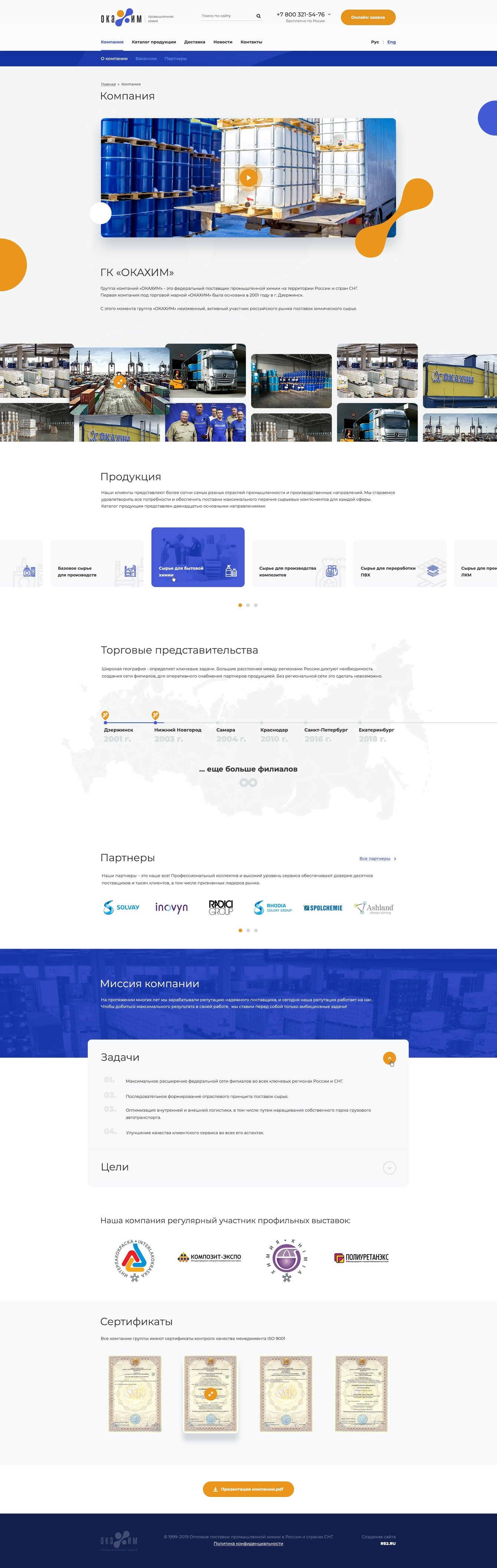 ГК «ОКАХИМ» неизменный и активный участник российского рынка поставок химического сырья. Репутация и статус компании во многом имеют определяющее значение для потребителей и поставщиков при выборе компаний Группы в качестве своих партнёров. Поэтому большое внимание уделено разработке страницы «О компании». История, миссия, лицензии и сертификаты, фотосъёмка производства и коллектива, новости об участии в конференциях и выставках — всё это отражено на данной странице.