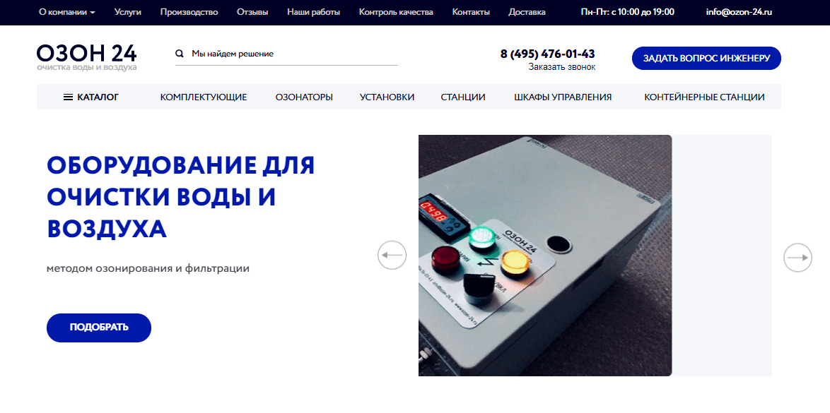 Теперь, с первых секунд нахождения на сайте понятно, чем занимается инженерная компания со сложными продуктами – от производства мелких деталей, до сборки станций по очистке и озонированию воздуха и воды.