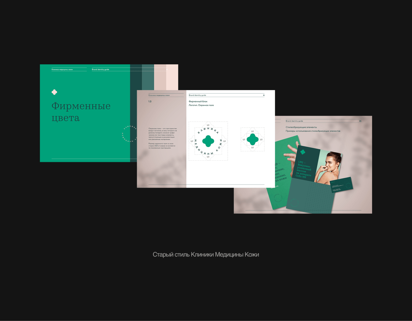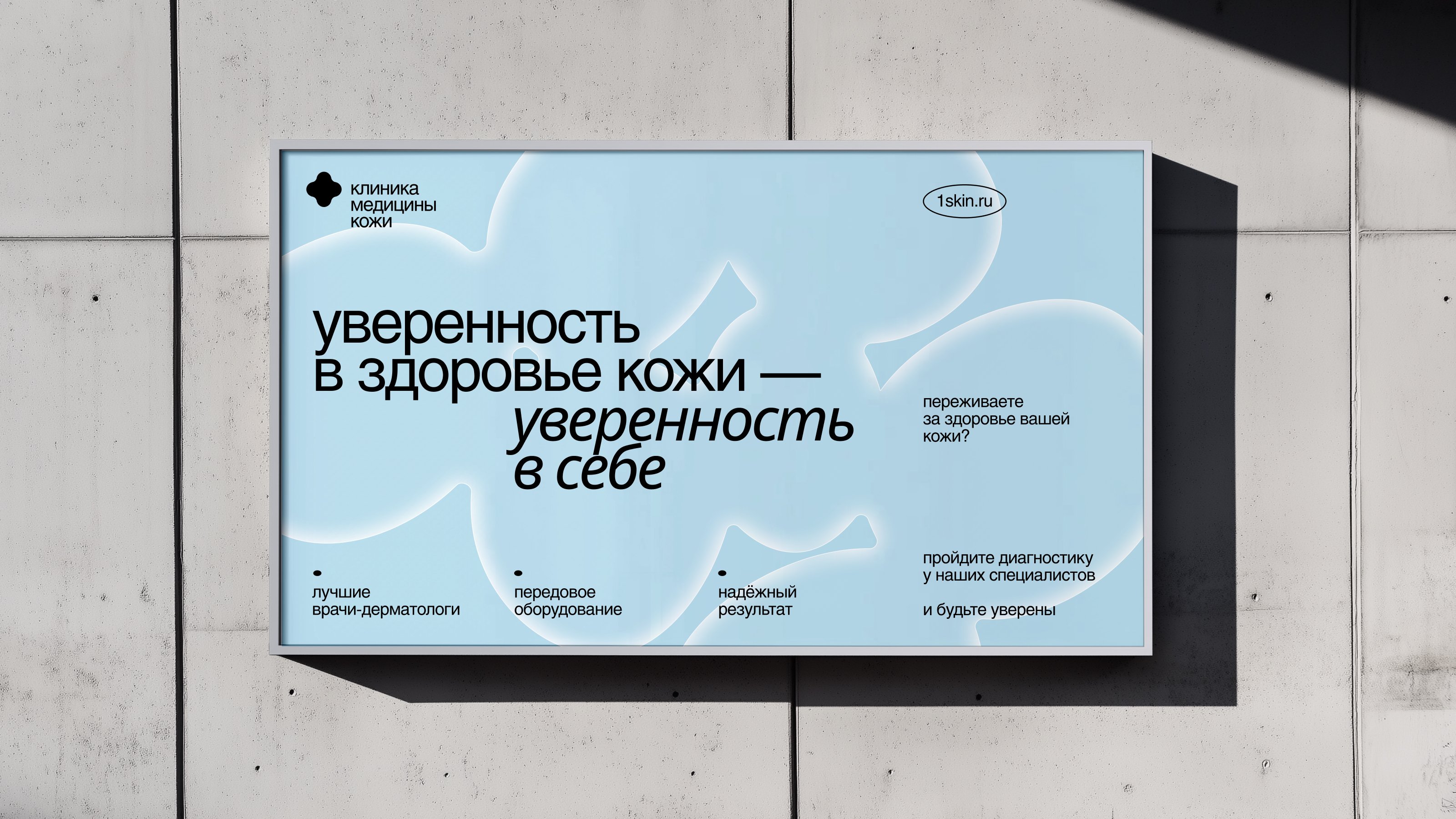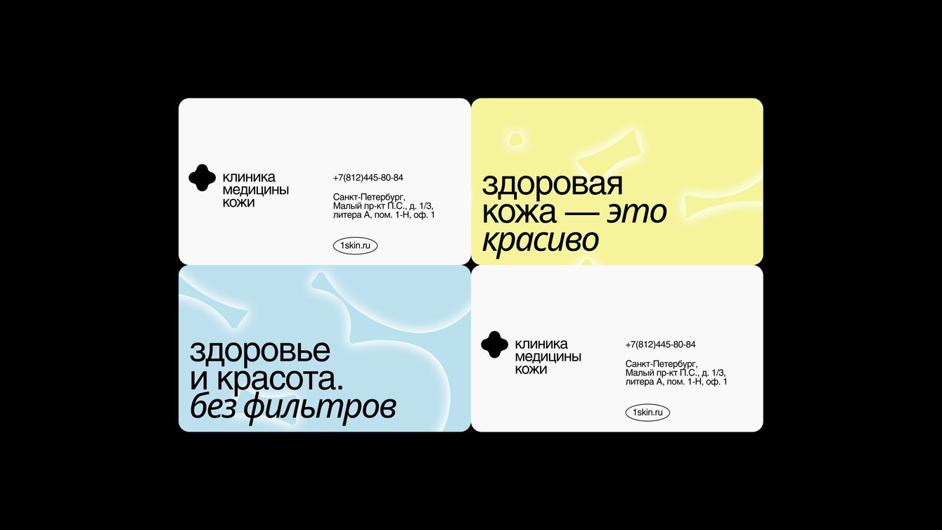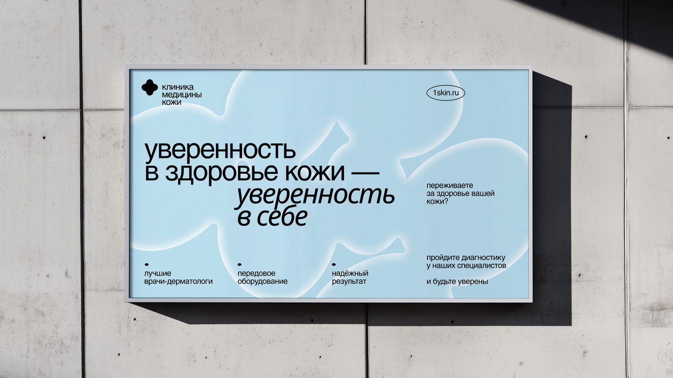 Руководители поддержали идею создания новой айдентики. Основой концепции стала идея, что красота начинается со здоровой кожи. Через визуал мы передали заботу, уверенность, естественность, но при этом показали строгость и надёжность клиники. Об айдентике у нас есть отдельный кейс — читайте в нашем профиле на workspace.