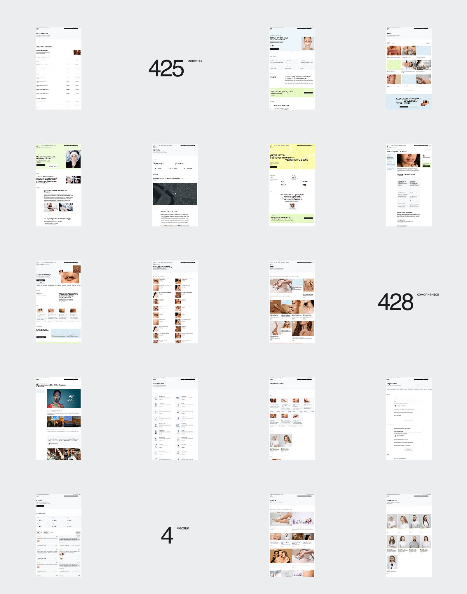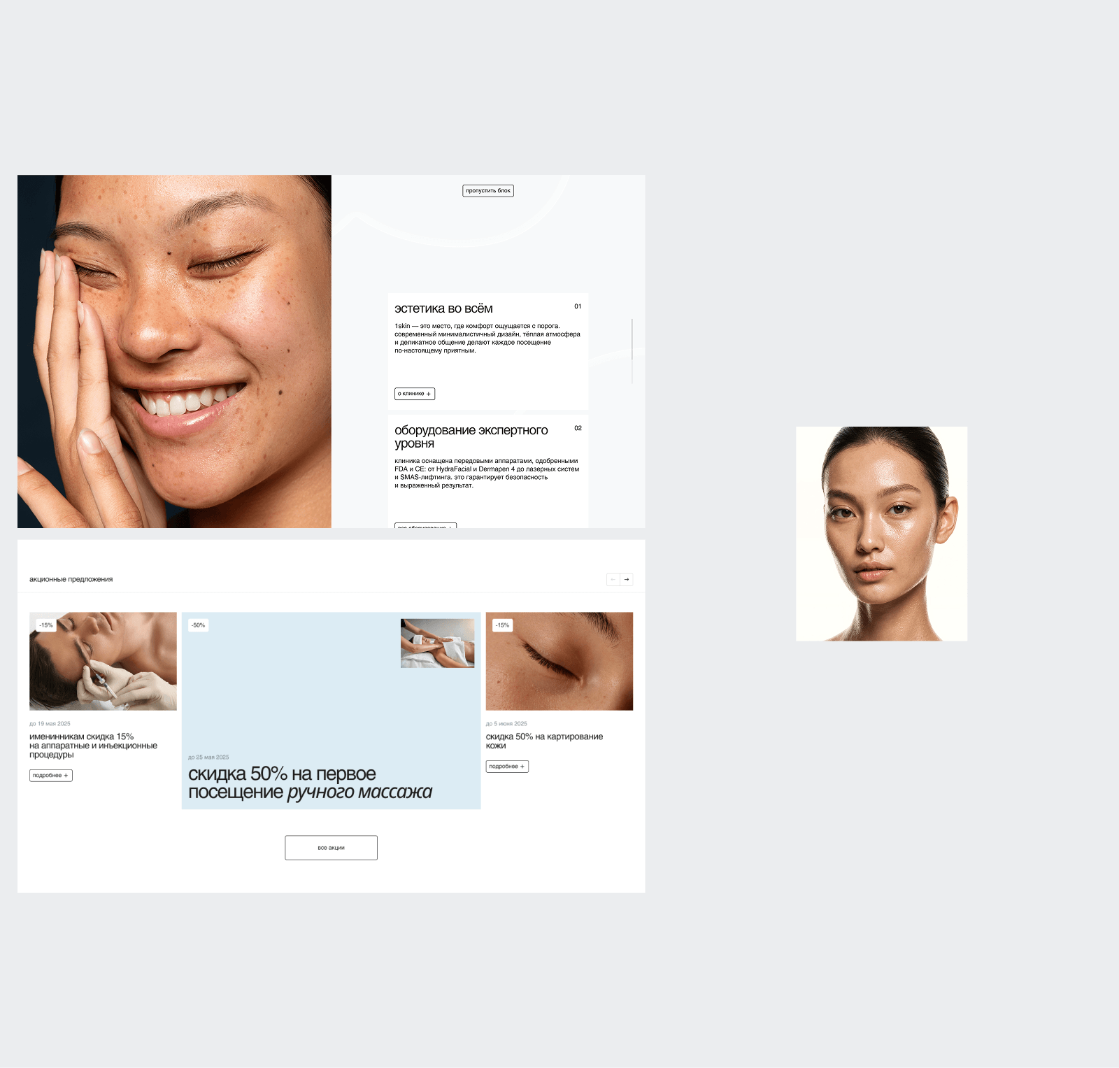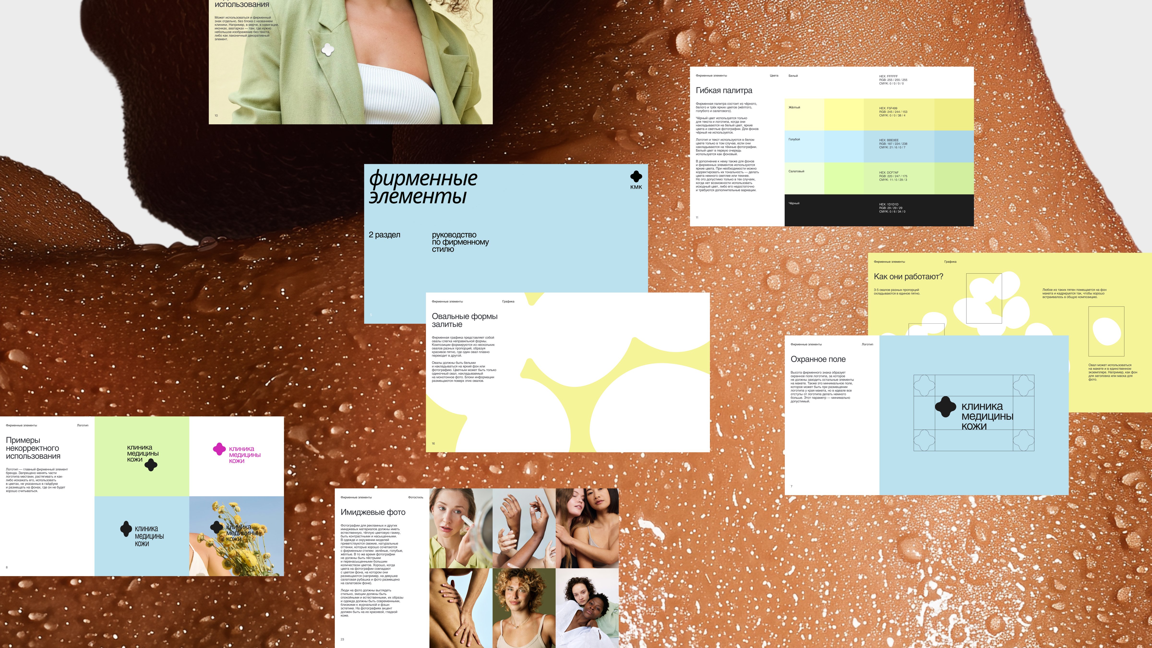 Руководители поддержали идею создания новой айдентики. Основой концепции стала идея, что красота начинается со здоровой кожи. Через визуал мы передали заботу, уверенность, естественность, но при этом показали строгость и надёжность клиники. Об айдентике у нас есть отдельный кейс — читайте в нашем профиле на workspace.