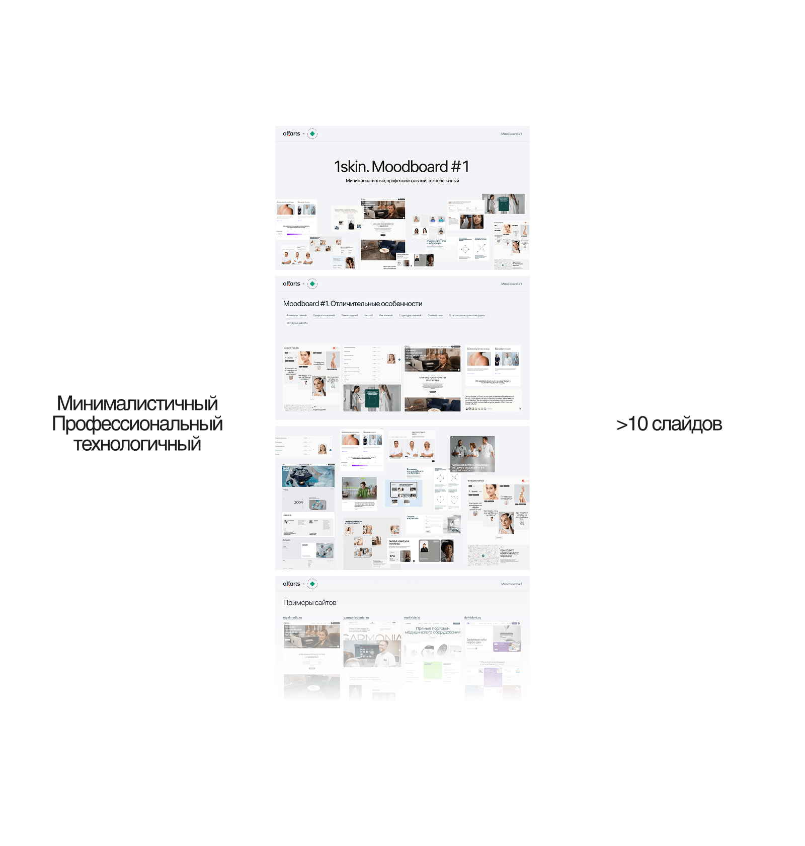 Для согласования общей стилистики подготовили два варианта мудбордов с разными настроениями. Ориентировались на проекты, релевантные нише. Один мудборд — более строгий, профессиональный. Второй — эмоциональный, с яркими акцентами. Клиент выбрал решение на стыке: им важно было подчеркнуть, что у них именно клиника, а не салон красоты, но при этом сохранить живые, привлекательные образы.