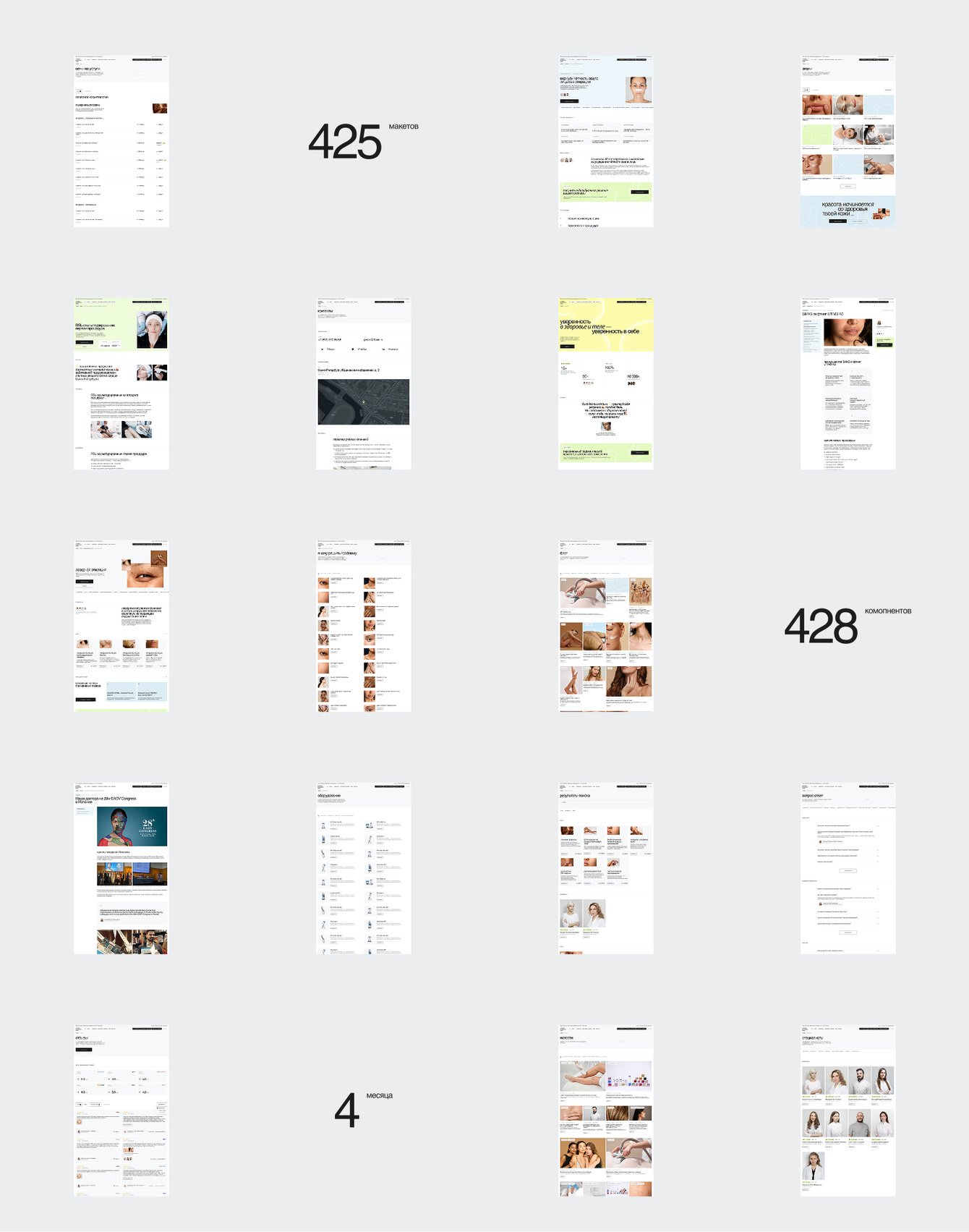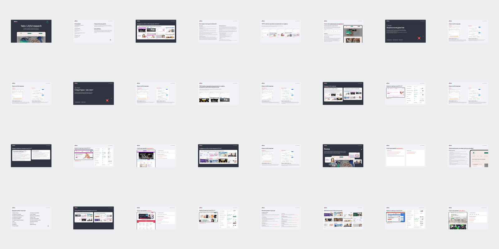 Параллельно провели UX/UI 20 сайтов конкурентов. Отобрали самые популярные ресурсы в нише косметологии и дерматологии на рынке России и Санкт-Петербурга. Обращали внимание на объём трафика, метрики и показатели производительности, чтобы выявить наиболее эффективных конкурентов.