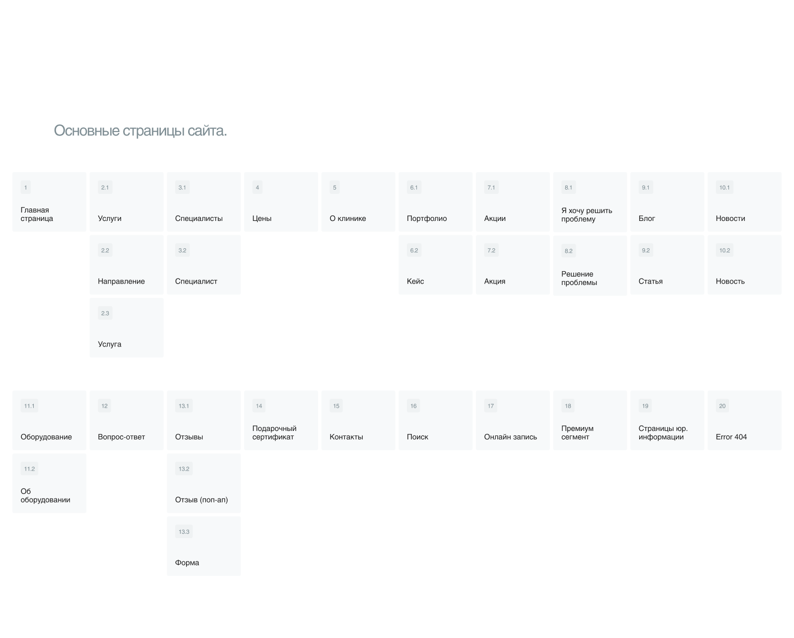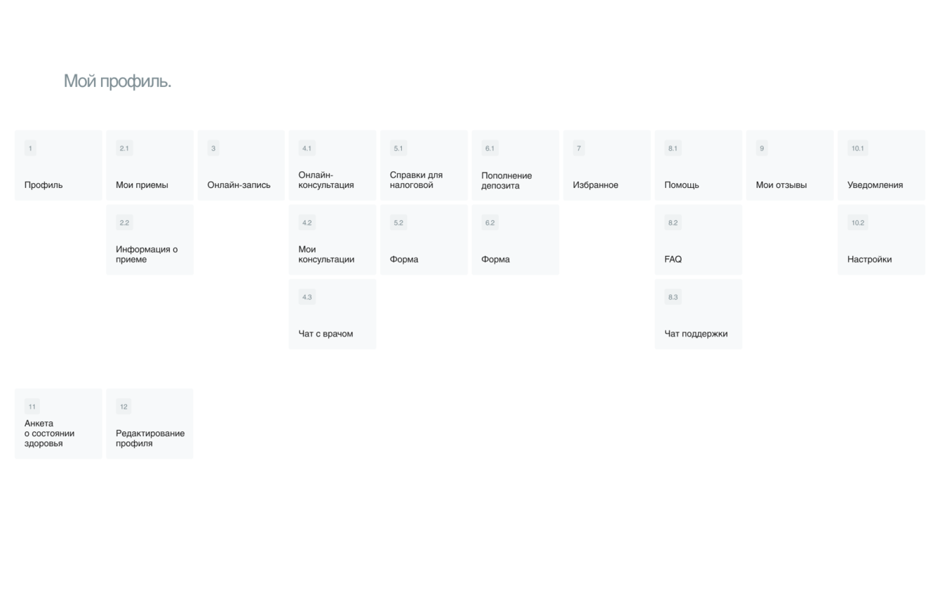 На основе всех данных мы сформировали структуру нового сайта «Клиники медицины кожа» и подготовили прототипы всех страниц.