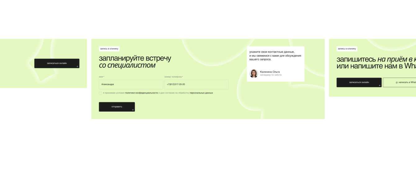 Адаптировали призывы к действию под сценарии. На каждой странице — свой call-to-action: на главной предлагаем познакомиться с клиникой, на страницах услуг — помочь с выбором, в профилях врача — сразу записаться на приём.
