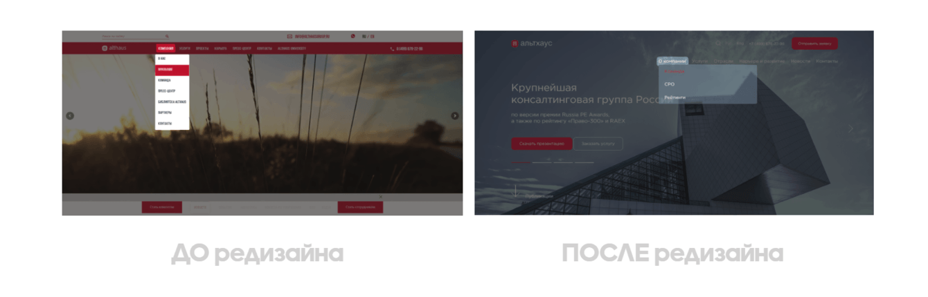 Раньше в разделе «Компания» было слишком много страниц, которые нелогично было разносить, так как они как раз должны давать полное представление об организации. Поэтому мы сгруппировали информацию по-новому, сделали структуру страницы более логичной и облегчили меню.