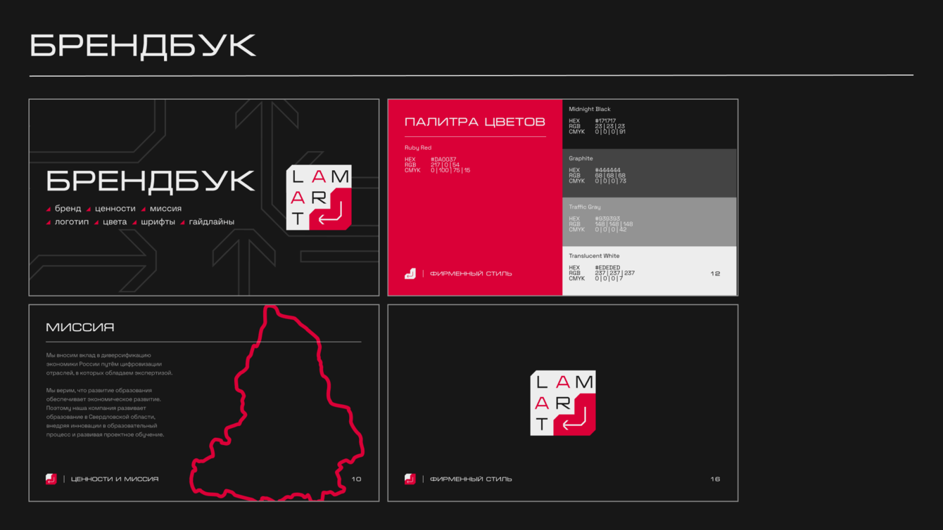 В основе легли решения из брендбука: выбрали выразительную палитру, где акцентный Ruby Red подчёркивает важное, а нейтральные графитовые и светлые оттенки создают ощущение структурности и доверия.