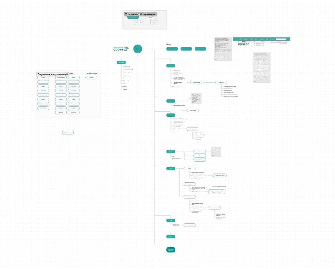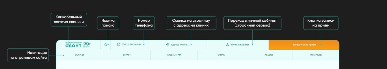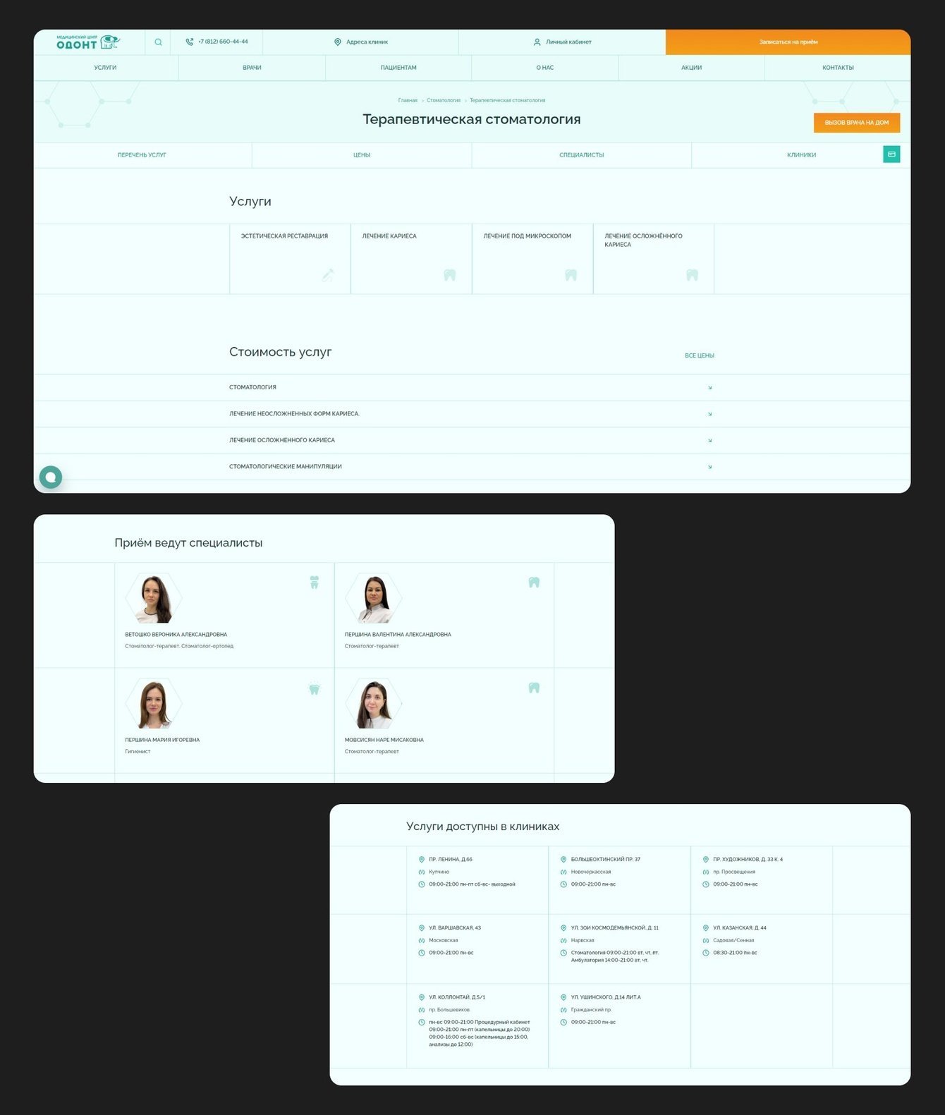 1) Первый уровень содержал логотип, поиск, номера телефонов, кнопки «Адреса клиник», «Личный кабинет» и кнопку записи на приём.