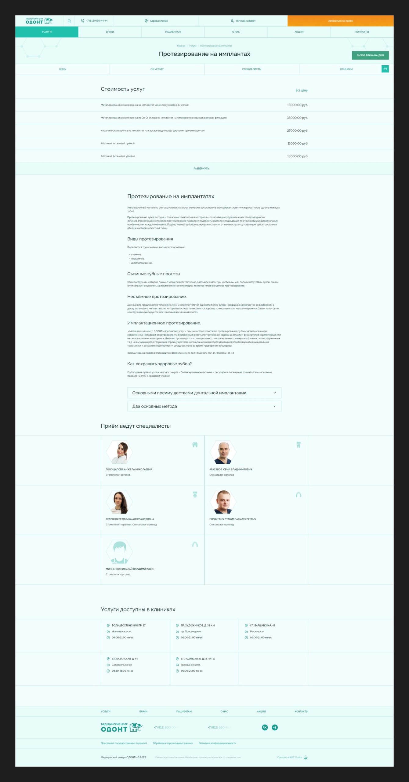 На страницу услуги сразу подтягиваются соответствующие цены, далее идёт описание услуги, перечень врачей, оказывающих услугу, и адреса клиник, в которых её могут оказать.