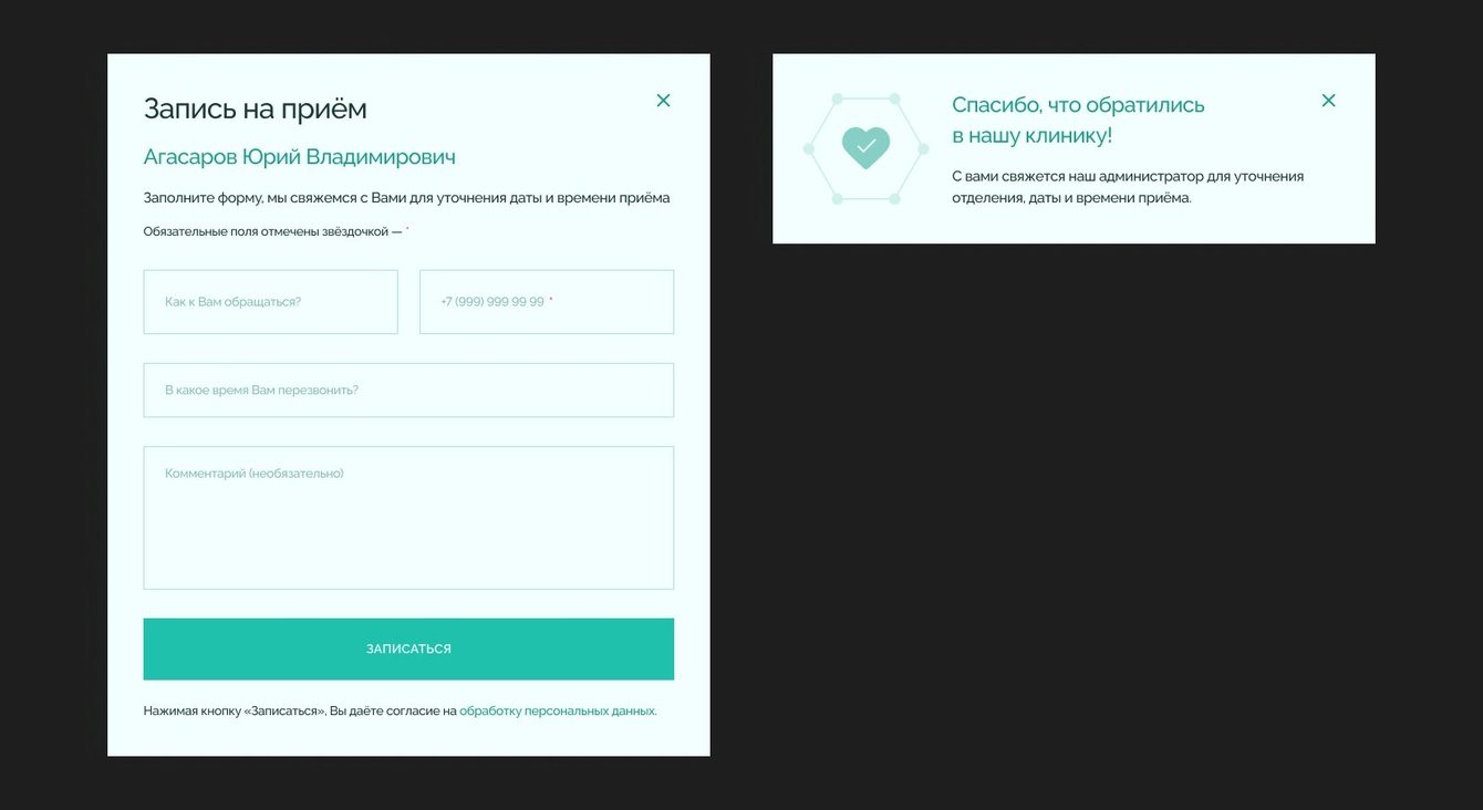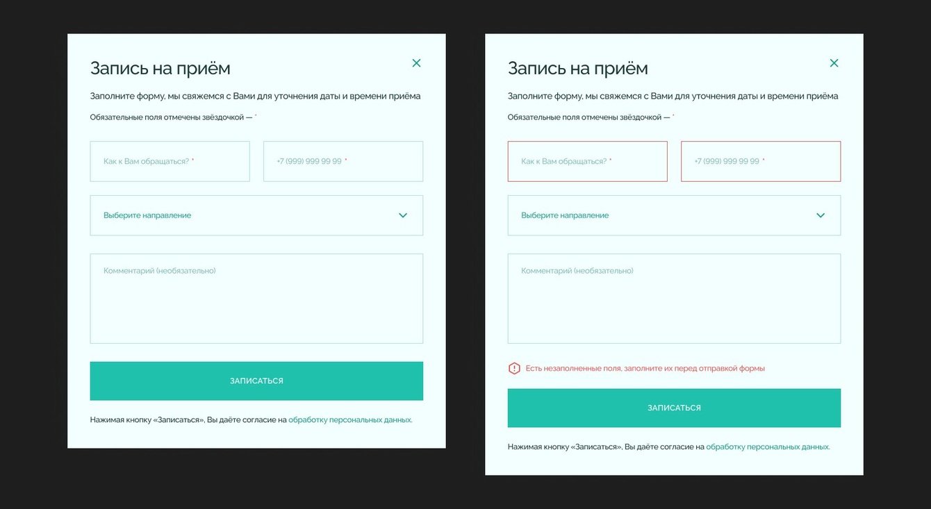 Пациент может записаться на приём через кнопку в шапке сайта. Для этого достаточно указать имя и номер телефона. Тут же можно выбрать интересующее направление и оставить комментарий. При незаполненных полях или ошибках в вводе пользователь увидит сообщение об этом, а поля с ошибкой подсветятся.