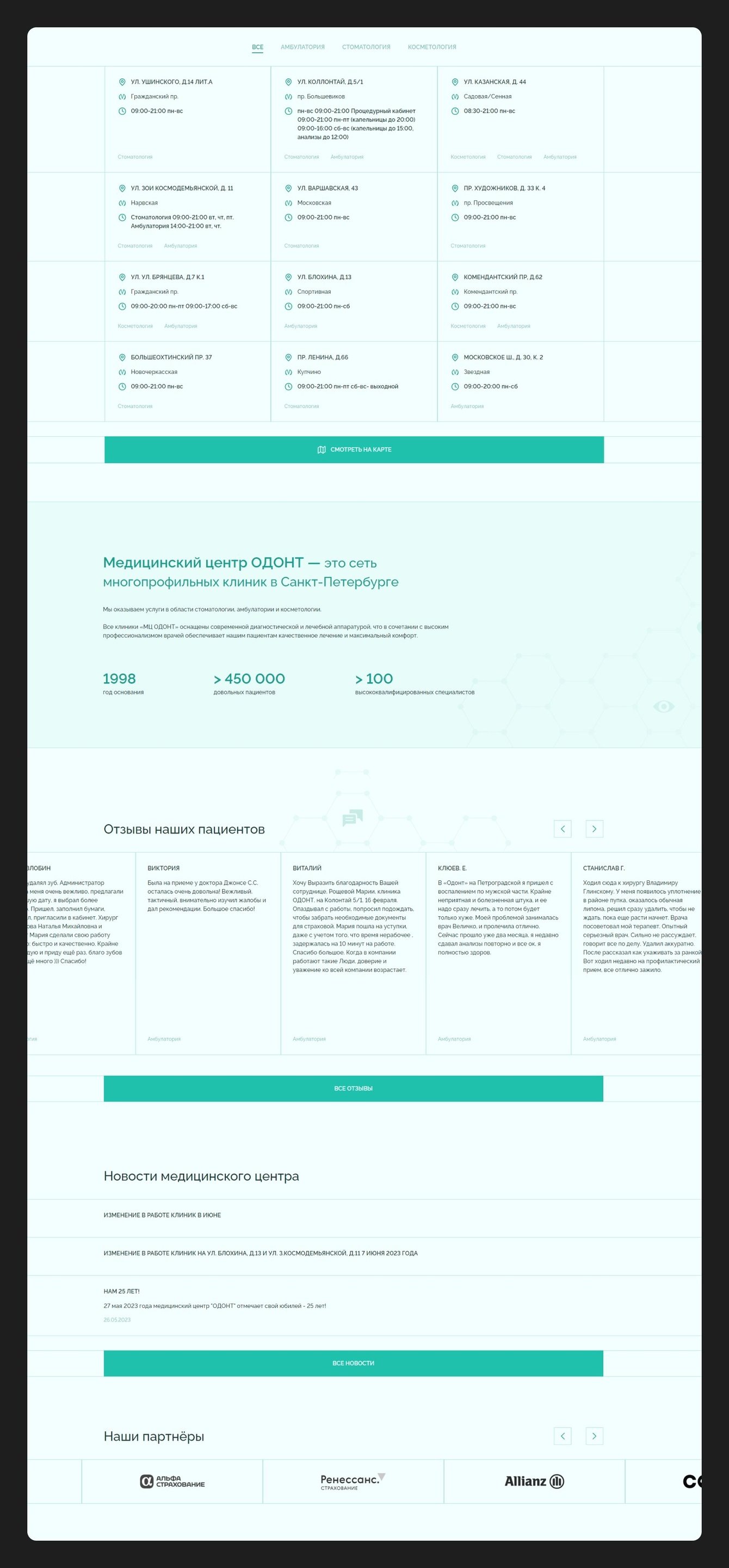 После направлений на главной странице расположились адреса клиник с отсылкой на карту, небольшой блок о медицинском центре, слайдер с отзывами пациентов, блок с последними новостями и партнёров.