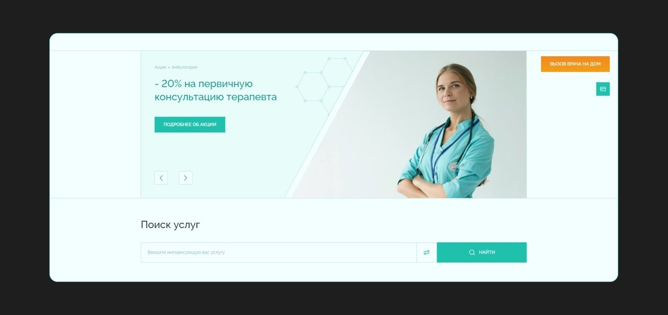 Однако заказчик засомневался и попросил реализовать иную концепцию, где действующий логотип клиники станет основой всей композиции и сохранится цветовая гамма старого сайта.