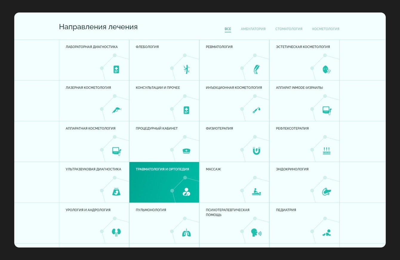 Дальше мы сделали акцент на направлениях услуг. Каждому направлению была присвоена своя собственная иконка.