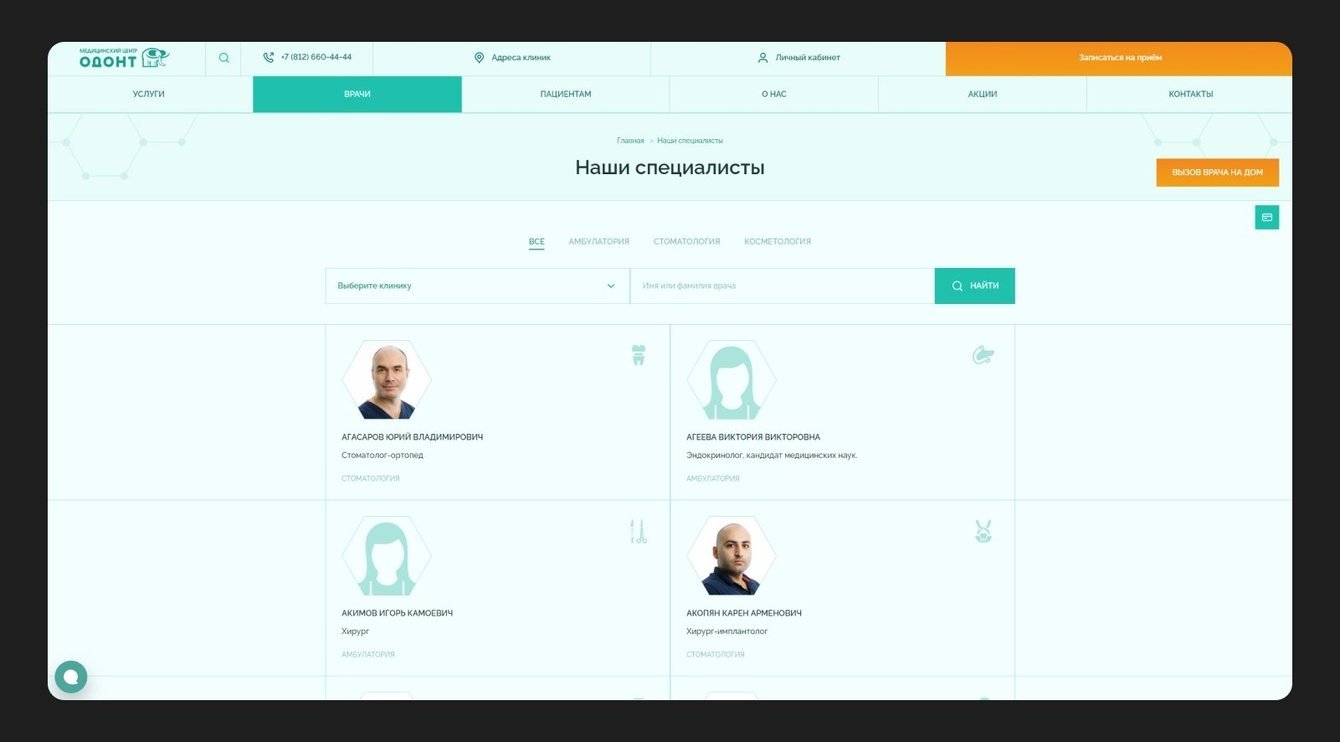 На странице с врачами предусмотрена фильтрация по трём подразделениям клиники, а также по адресам, где принимают специалисты. Можно быстро найти нужного врача по имени или фамилии.