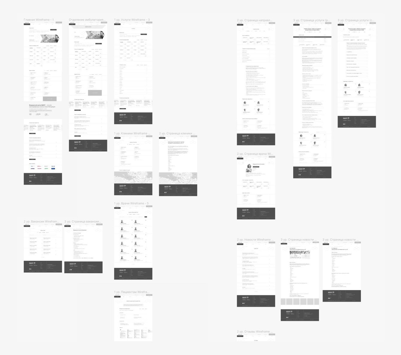 1) Первый уровень содержал логотип, поиск, номера телефонов, кнопки «Адреса клиник», «Личный кабинет» и кнопку записи на приём.