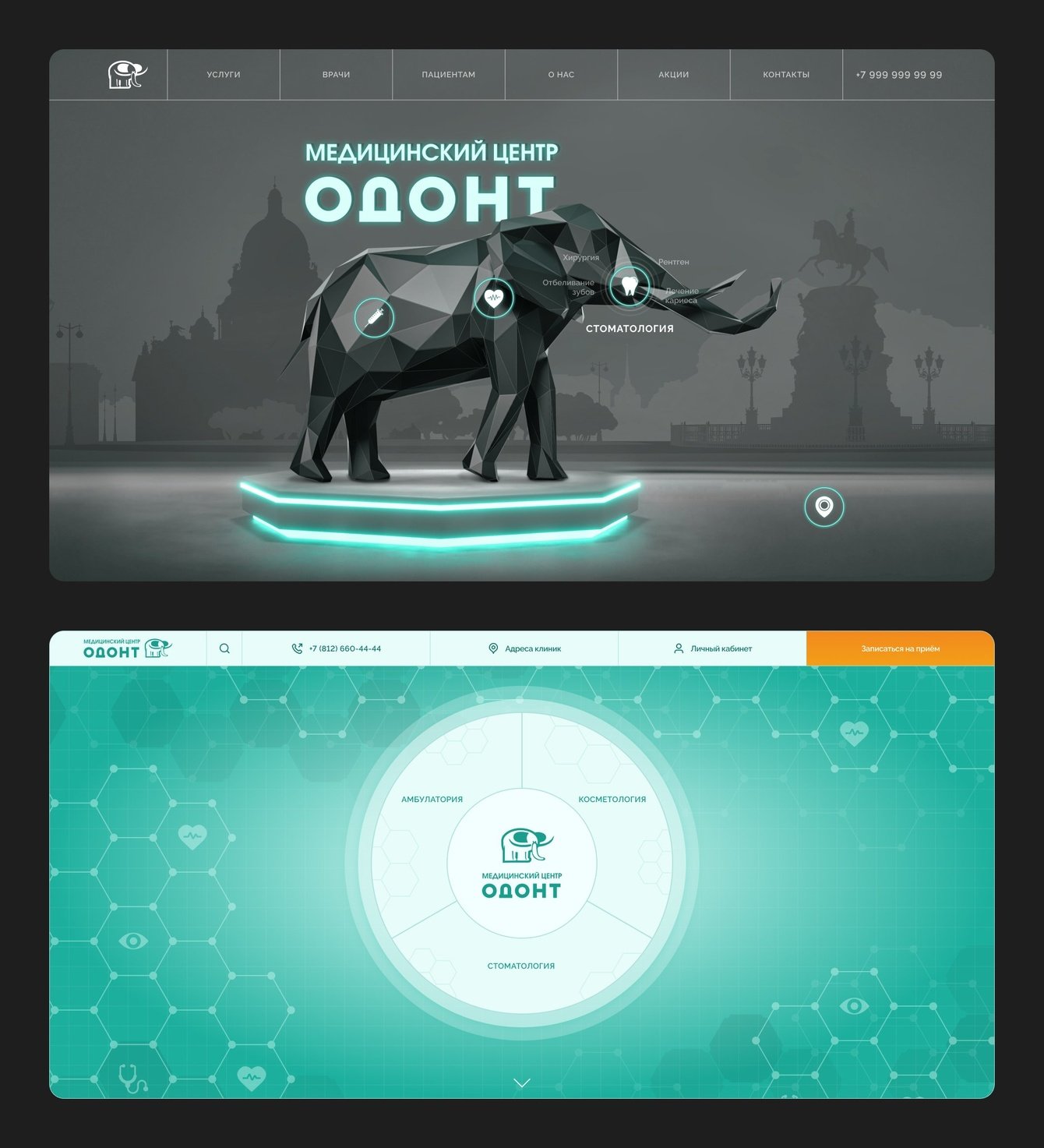Кстати, одна из первых дизайн-концепций входа на сайт. Заказчик очень хотел слона при попадании на сайт и наша студия предложили креативное решение, которое смотрелось «дорого» или необычно. Образ забавного слоника из логотипа мы преобразовали в солидную фигуру слона, намекая сходством на многочисленные статуи и монументы Санкт-Петербурга, на которой разметили три подразделения клиники: амбулатория, стоматология и косметология.