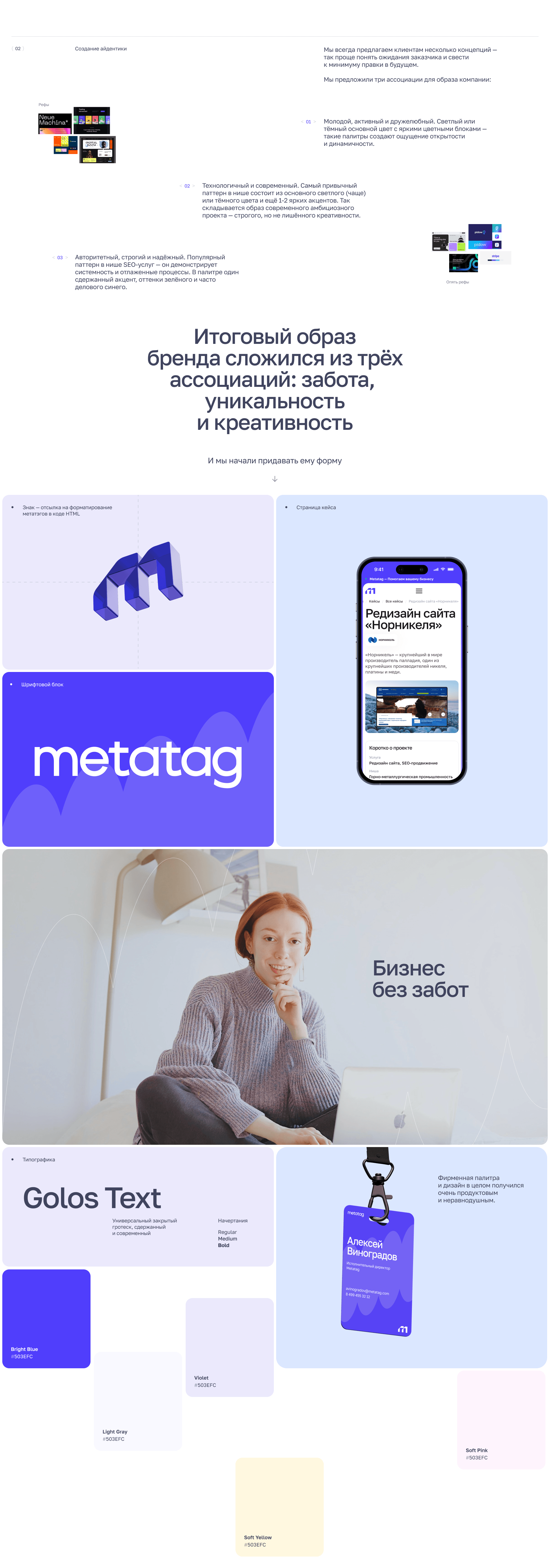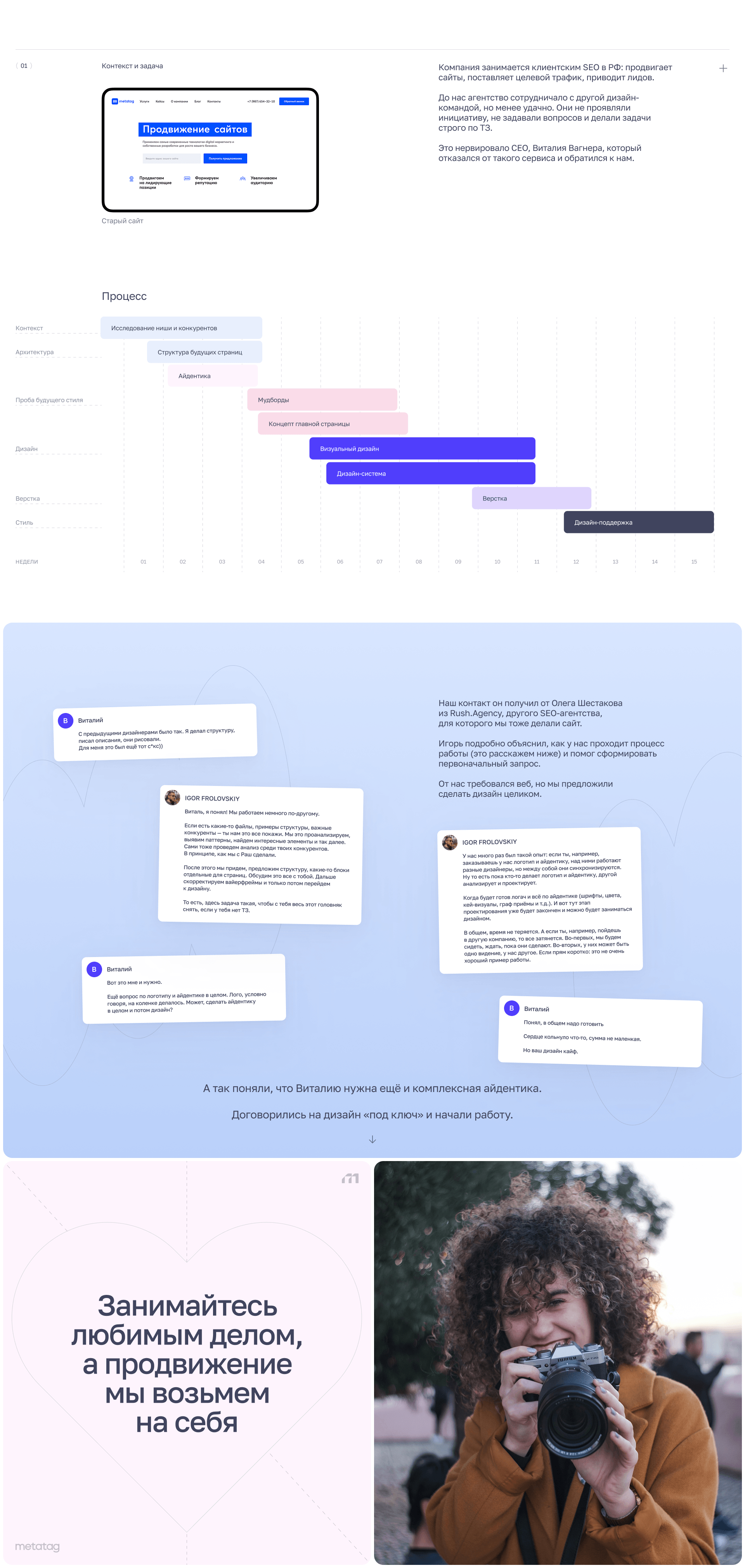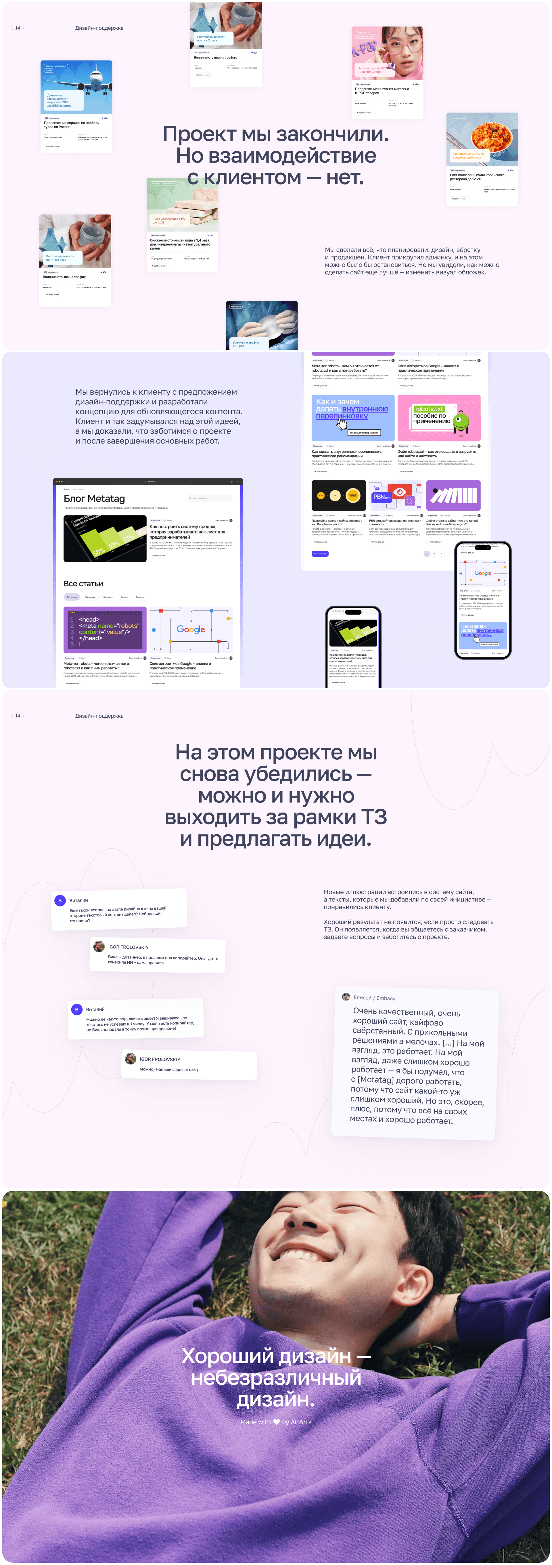 Особенно приятно, что дизайн Metatag.ru оценил Елисей Соловьев — head of design в Эмбаси. Это подтверждает, что мы сделали не просто красивую картинку, а продуманный, функциональный продукт, который работает.