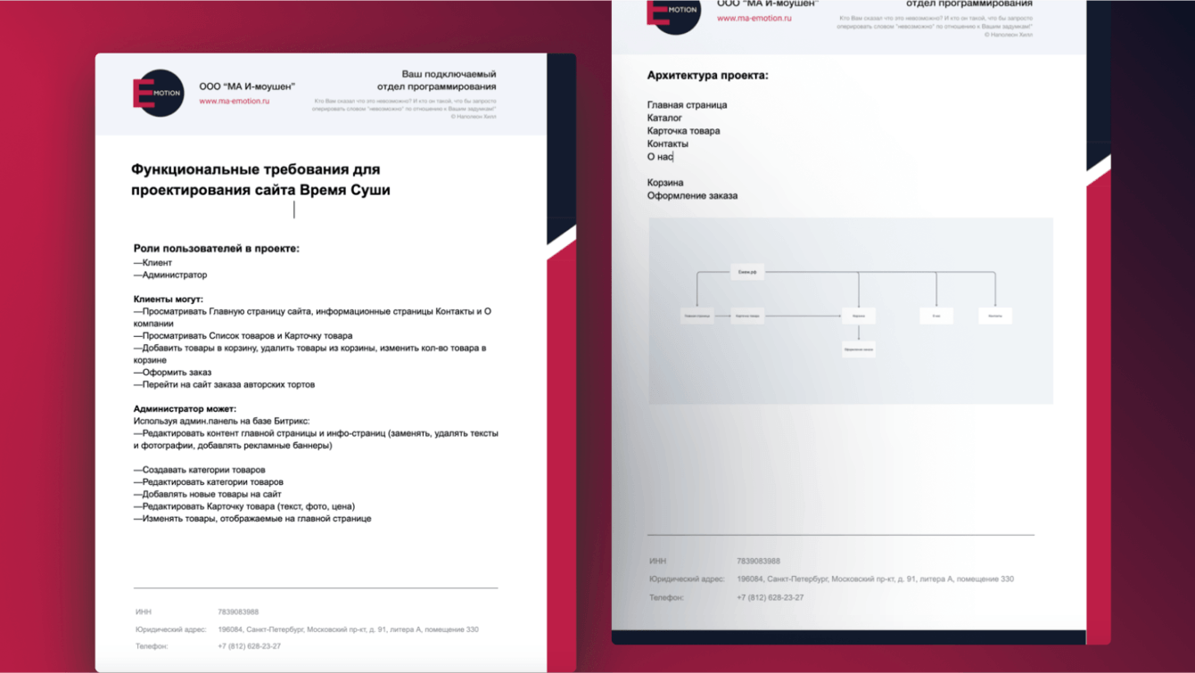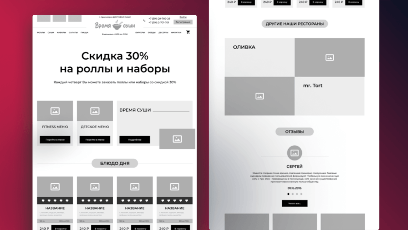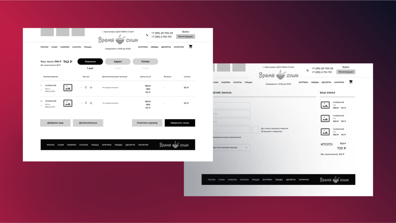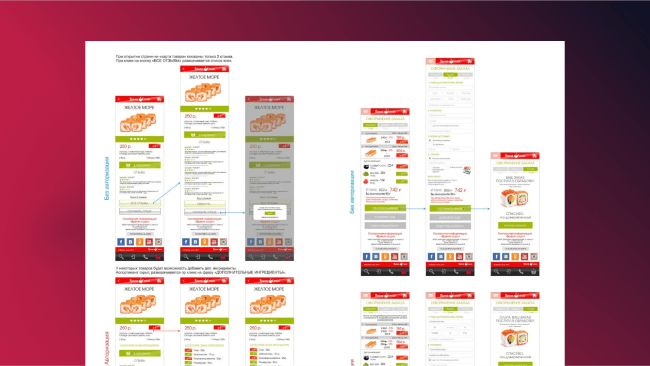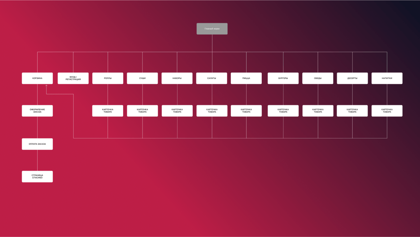 В ходе установочной сессии мы собрали функциональные требования и сформировали техническое задание к сайту. Руководствуясь ТЗ, утверждённым клиентом, спроектировали новый User Flow и структуру сайта. Мы прописали путь зарегистрированных и незарегистрированных пользователей таким образом, чтобы заказ еды стал максимально прост для обеих пользовательских групп.