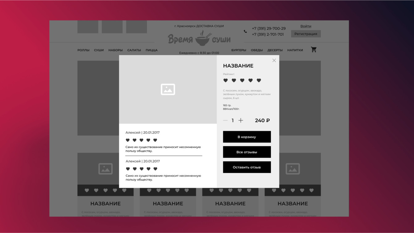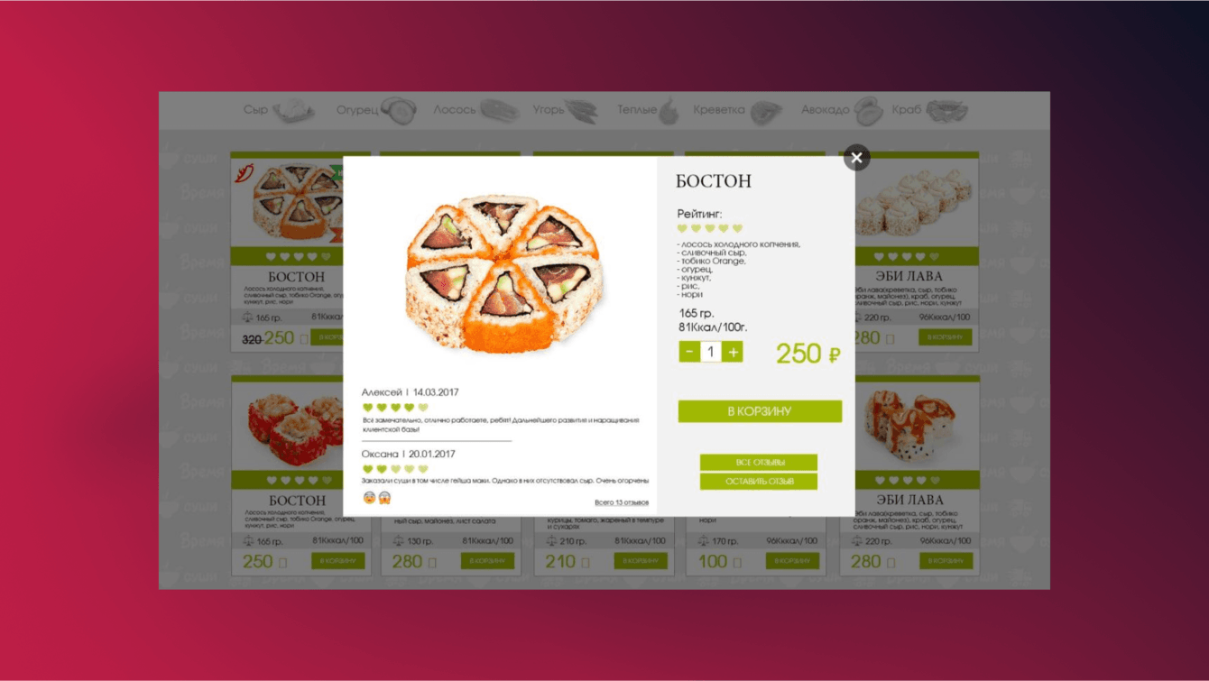 Полностью переработали карточку товара, уделив особое внимание читаемости информации и юзабилити: чтобы каждому пользователю было понятно, что, в каком количестве и по какой цене он приобретает. Добавили систему рейтингов и отзывов — для повышения лояльности к бренду и упрощения выбора еды.
