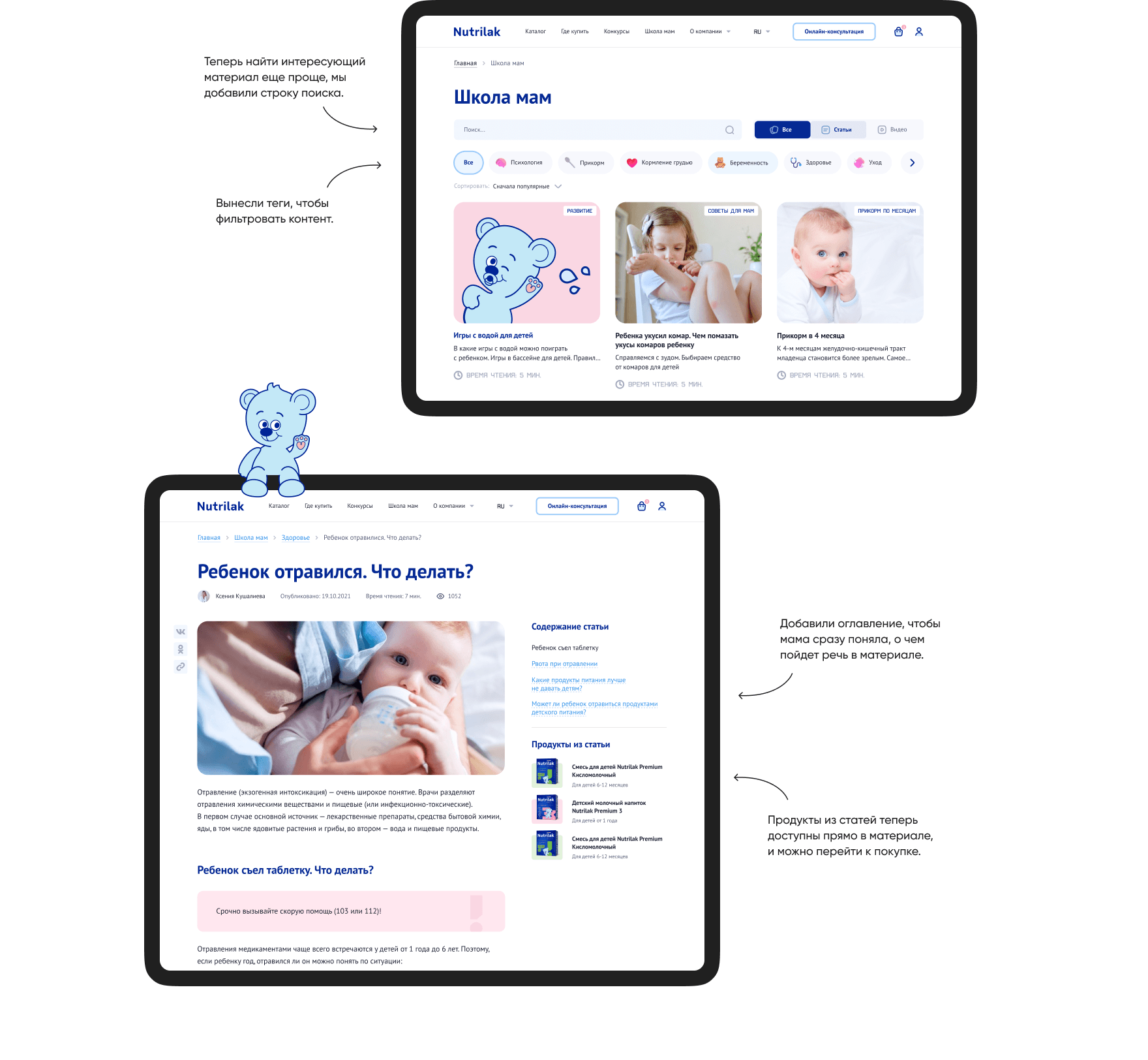 Мы проанализировали разделы сайта и выявили, что раздел «Школа мам» — наиболее посещаемый, поэтому решили его улучшить: структурировали контент, объединили статьи и видео, а еще добавили карточки товара в статьи, чтобы пользователи не тратили время на поиск.