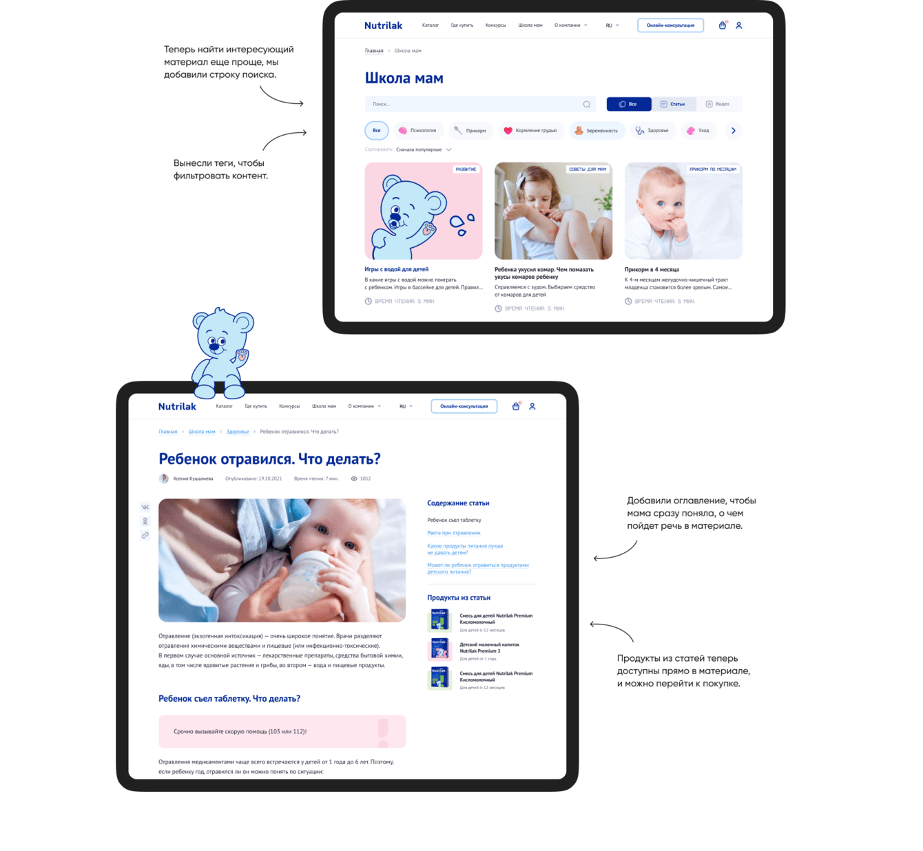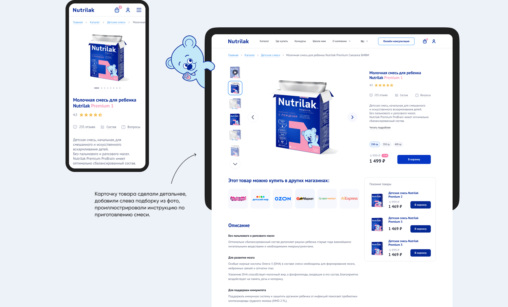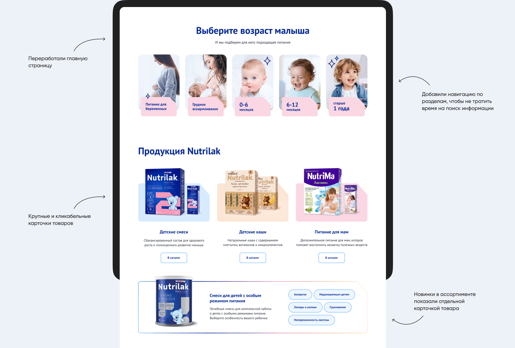 Мы пересмотрели подход к подаче материалов. Старались использовать самые привычные паттерны, чтобы мамы тратили меньше усилий на покупку детского питания и на поиск нужной информации.
