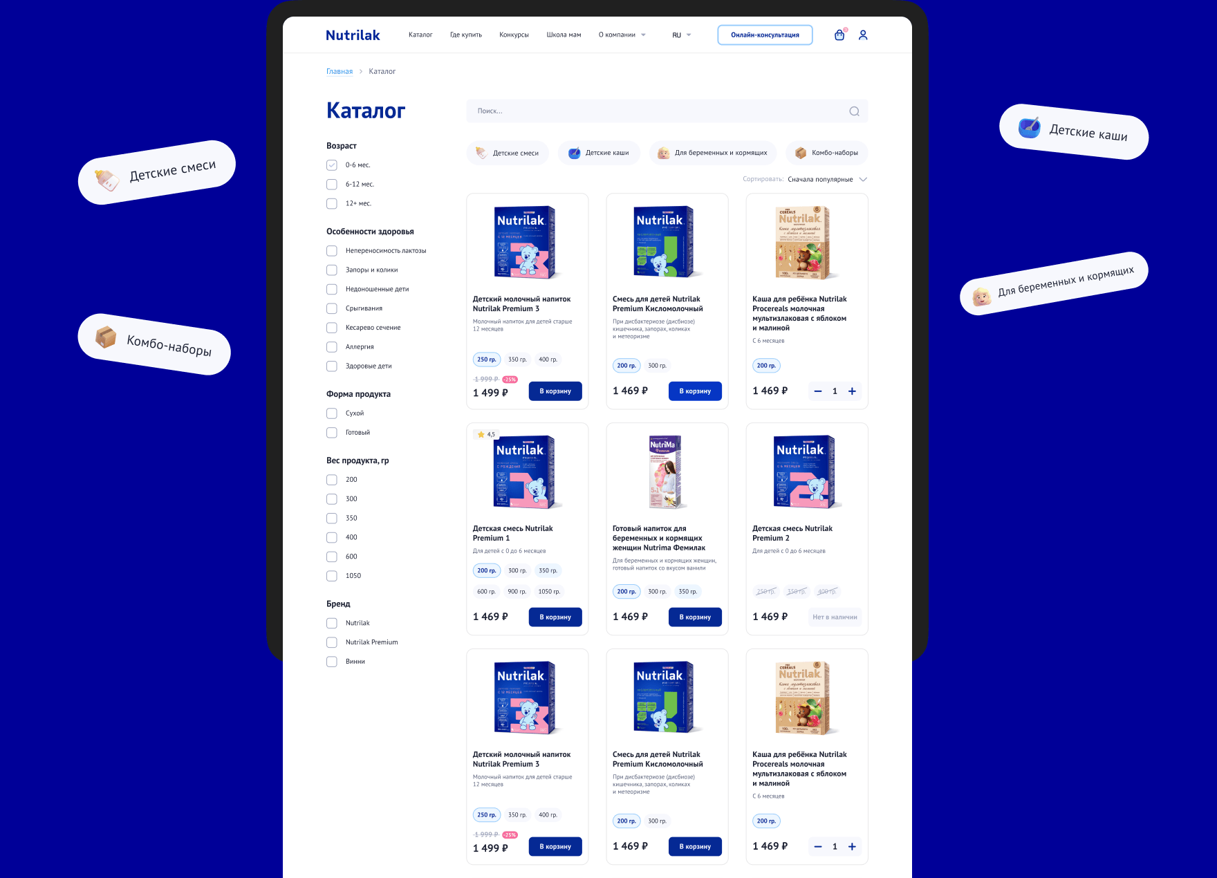 Теперь дизайн сайта соответствует брендбуку компании и работает на цели маркетинга. Мы старались использовать самые привычные паттерны, чтобы мамы и папы тратили меньше времени на поиск нужной информации, товара и на сам процесс покупки.